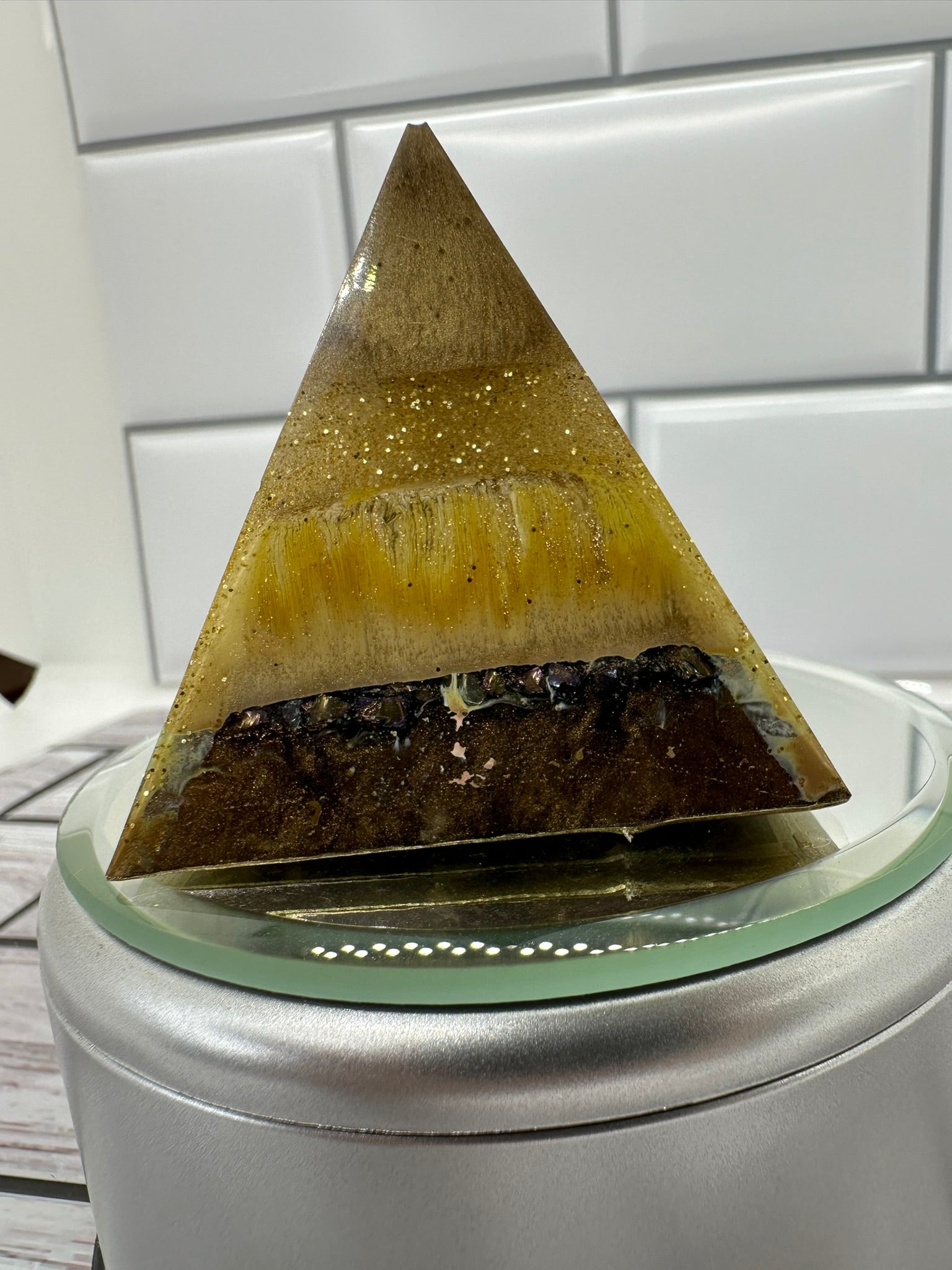 Embrace the beauty of imperfection with this unique resin pyramid.
