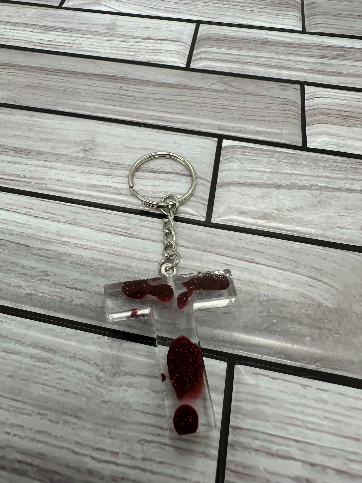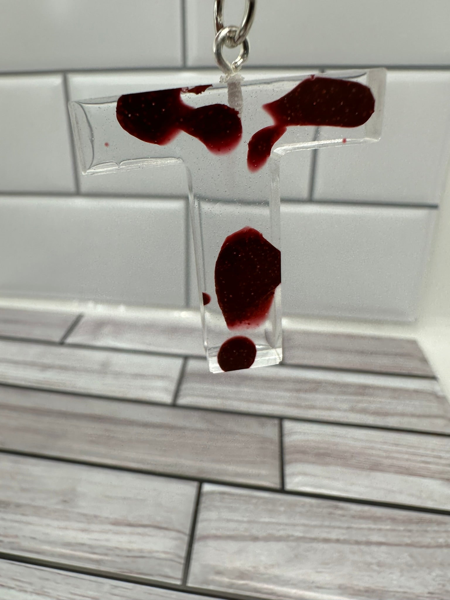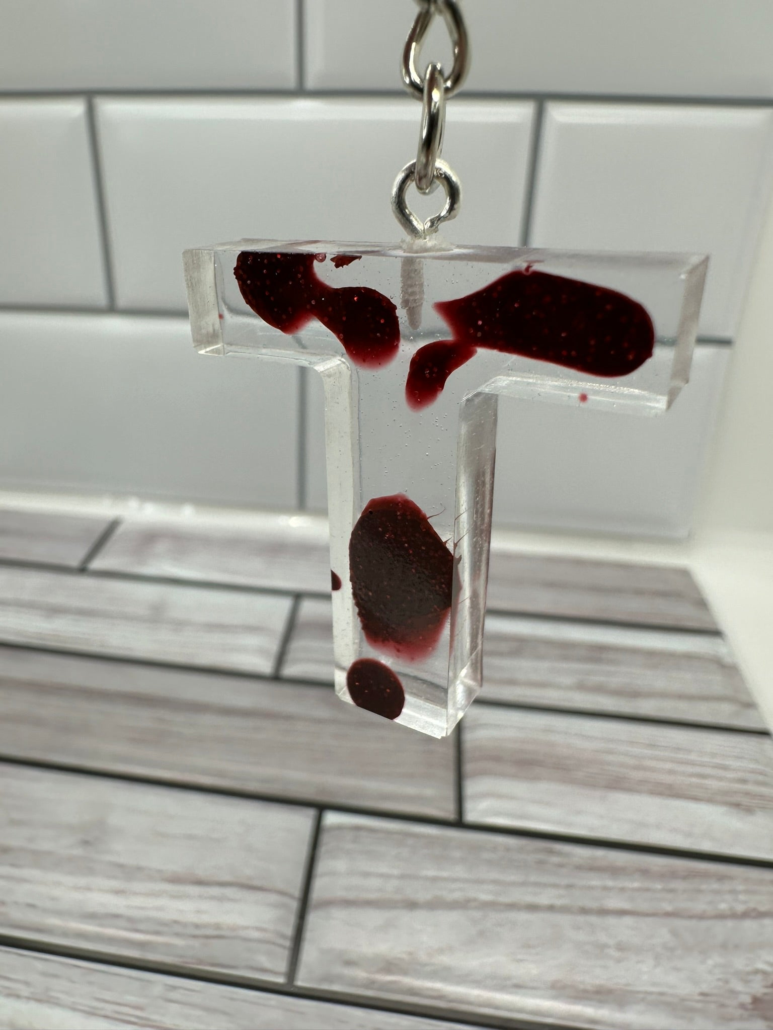 This spooky resin keychain features the letter "T" with a splash of faux blood and shimmering red glitter. The translucent resin showcases the intricate details of the blood splatter, creating a unique and eye-catching design. Perfect for Halloween or horror fans, this keychain is sure to add a touch of macabre charm to your keys or bag.