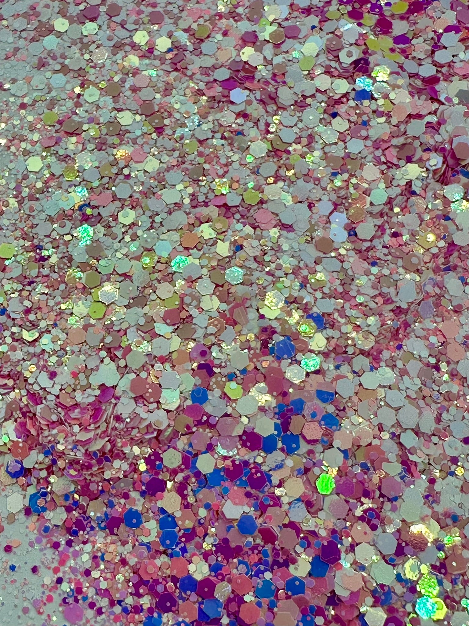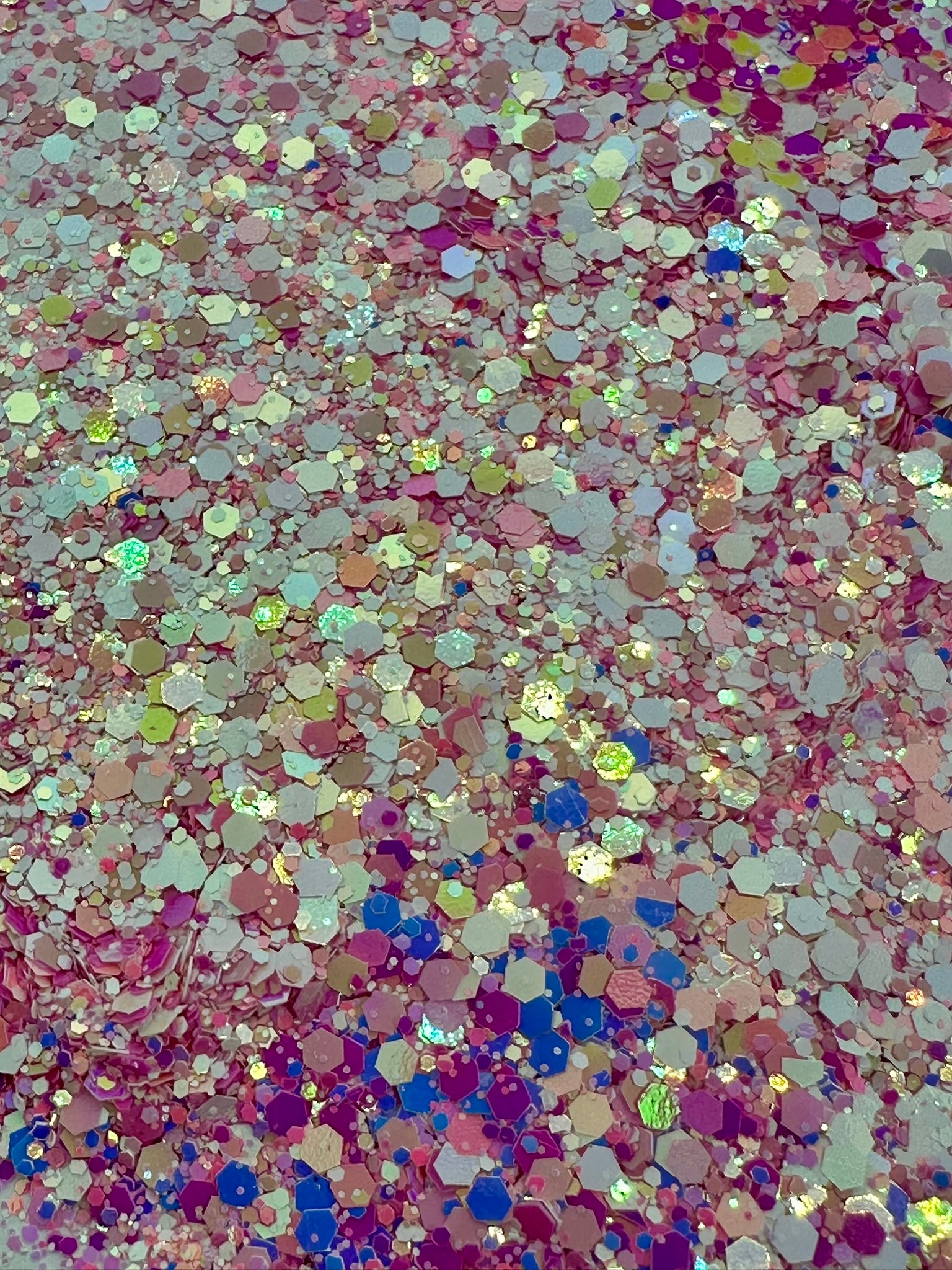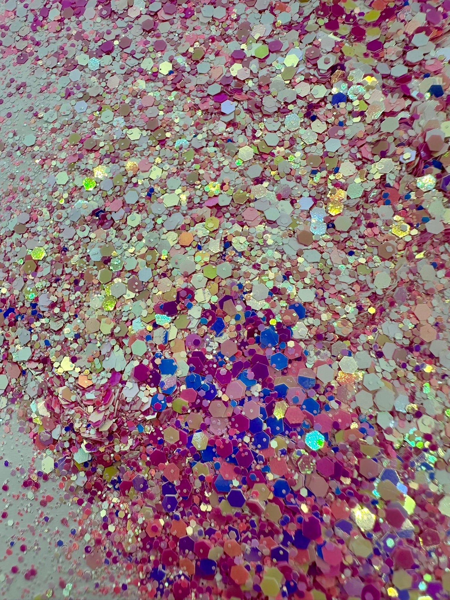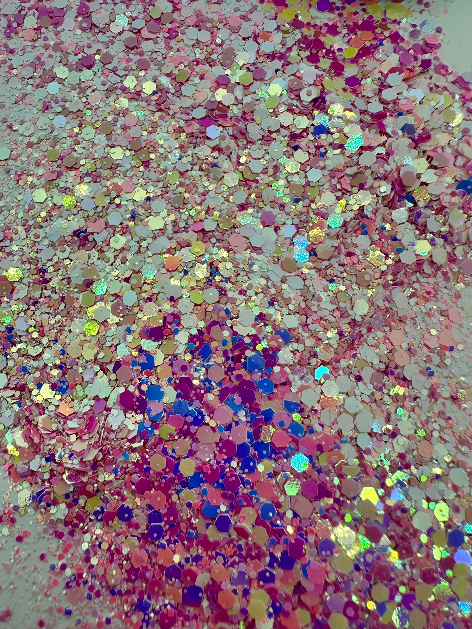 Dive into a cosmic swirl of color with our Bubblegum Galaxy glitter. Featuring a mix of hexagonal shapes in vibrant pinks, ethereal purples, and twinkling blues, each fleck catches the light for an irresistible, multi-dimensional sparkle.
