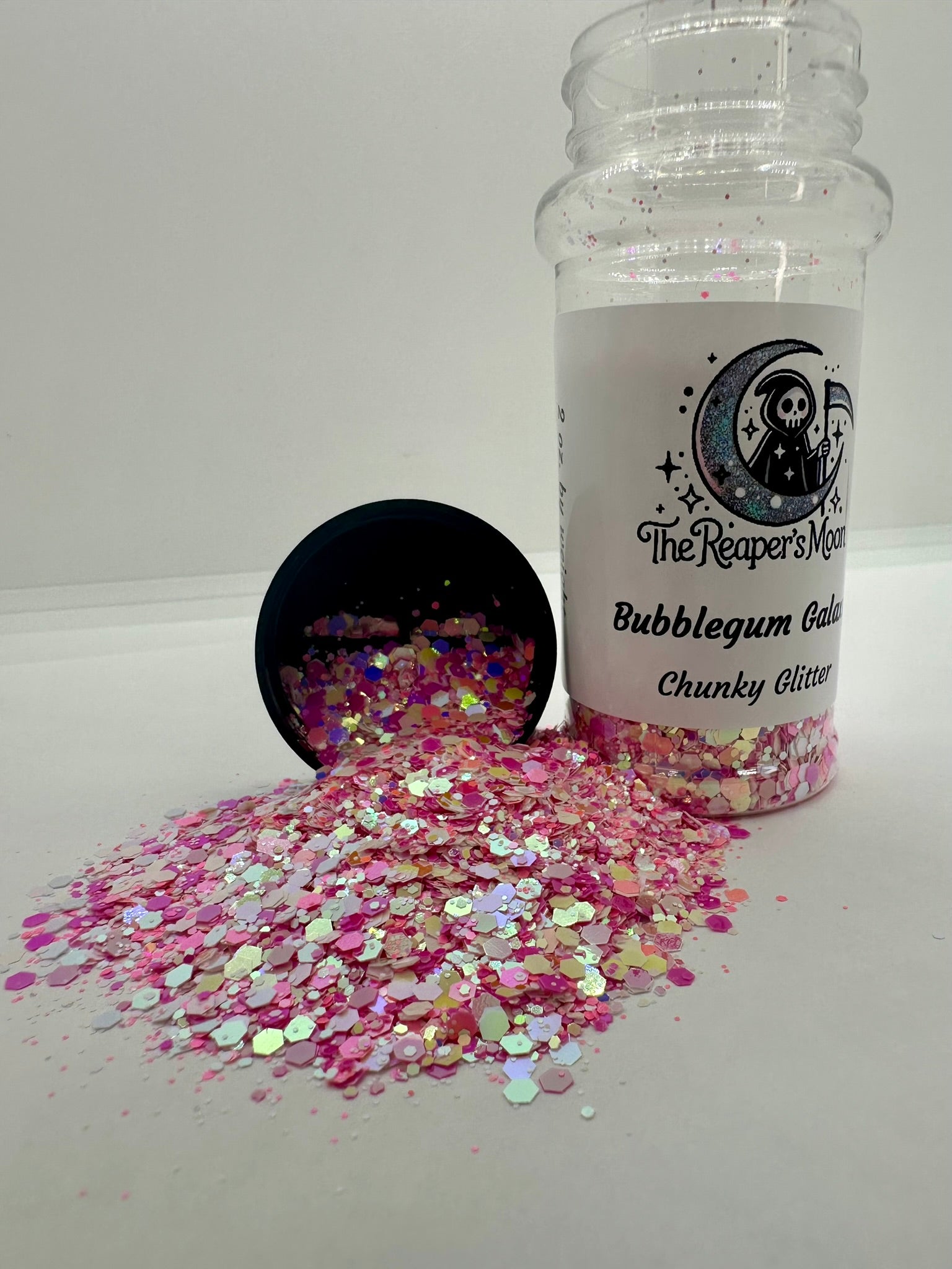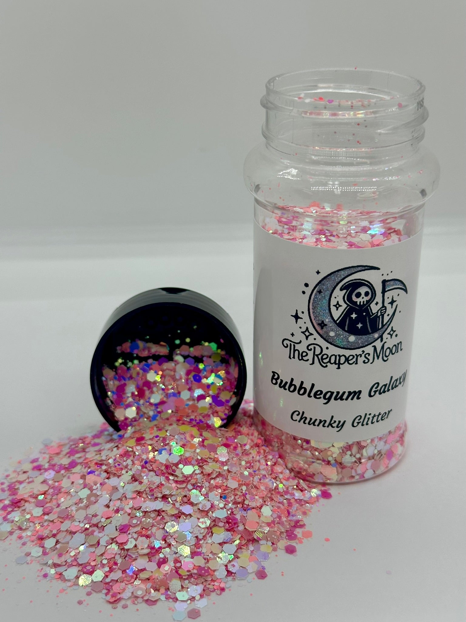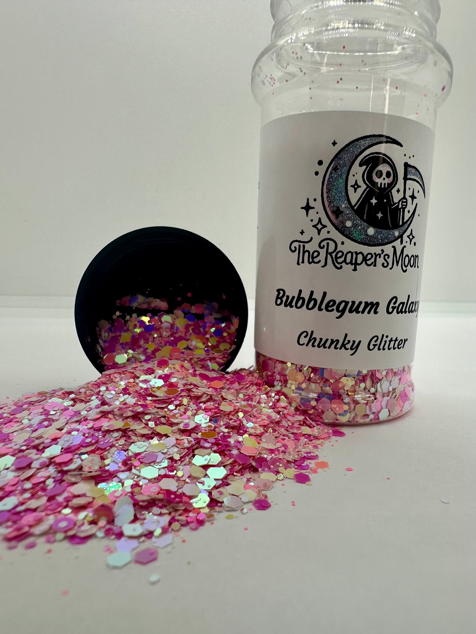 Dive into a cosmic swirl of color with our Bubblegum Galaxy glitter. Featuring a mix of hexagonal shapes in vibrant pinks, ethereal purples, and twinkling blues, each fleck catches the light for an irresistible, multi-dimensional sparkle.