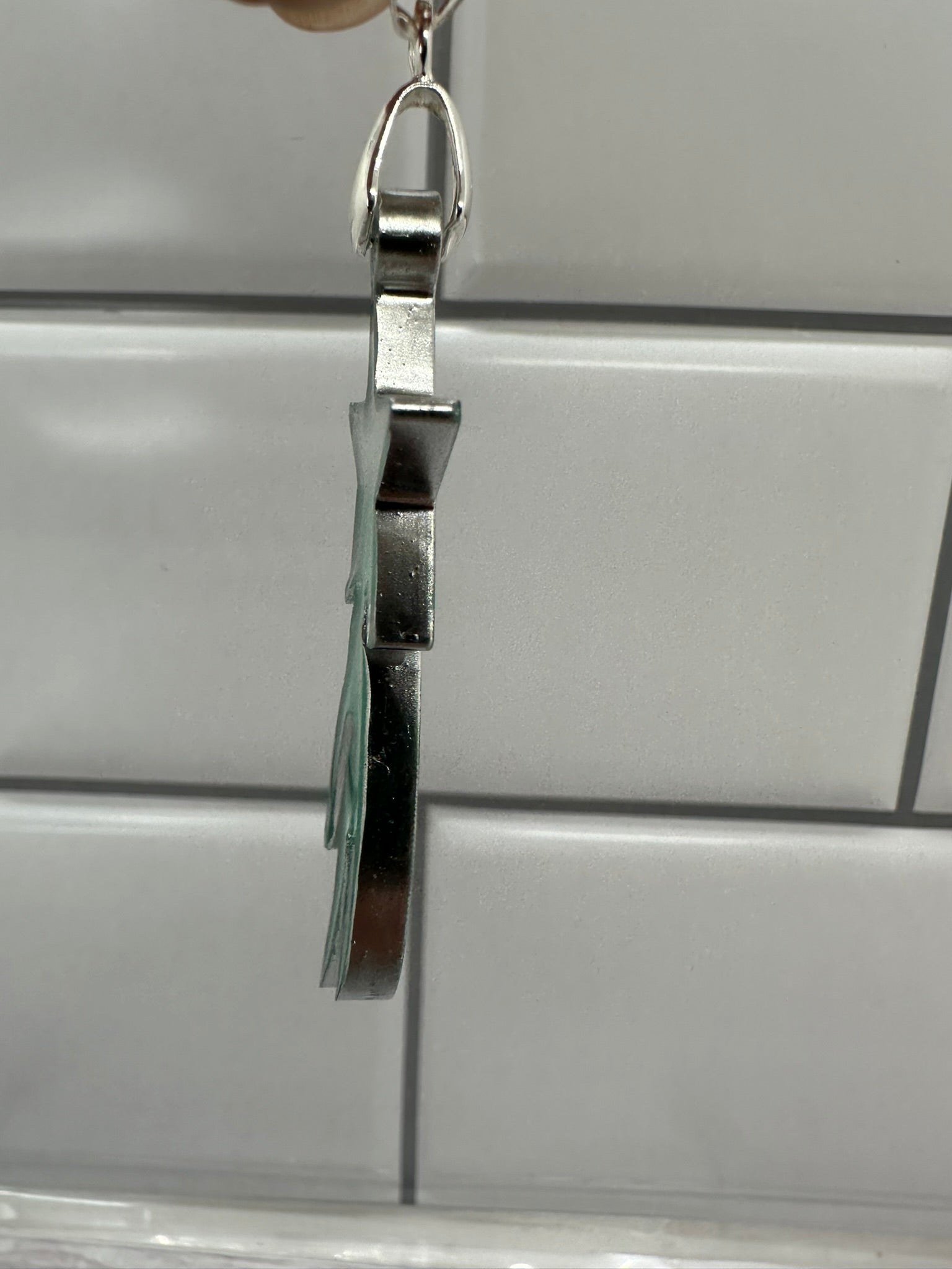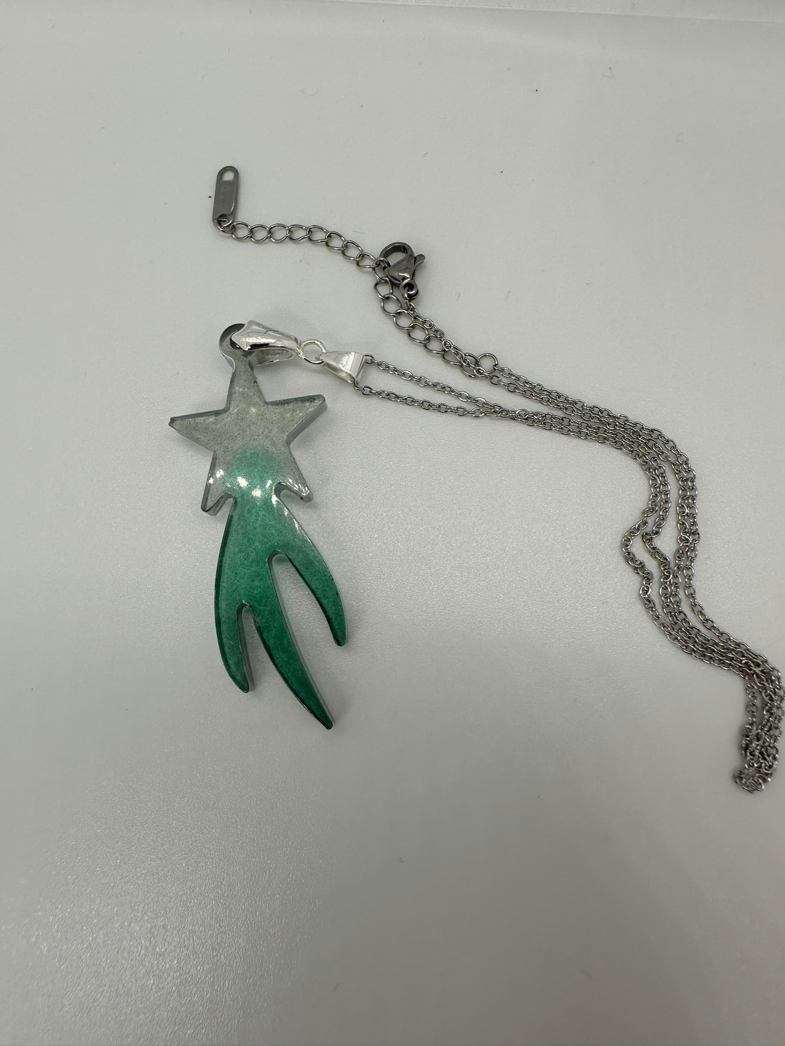 This enchanting pendant captures the magic of a shooting star streaking across the night sky. The pendant features a clear resin base that gradually transitions to a vibrant green hue, reminiscent of the Earth's atmosphere. A shimmering silver star is suspended within the resin, adding a touch of celestial wonder. The pendant is finished with a silver bail, making it ready to be worn on your favorite chain.