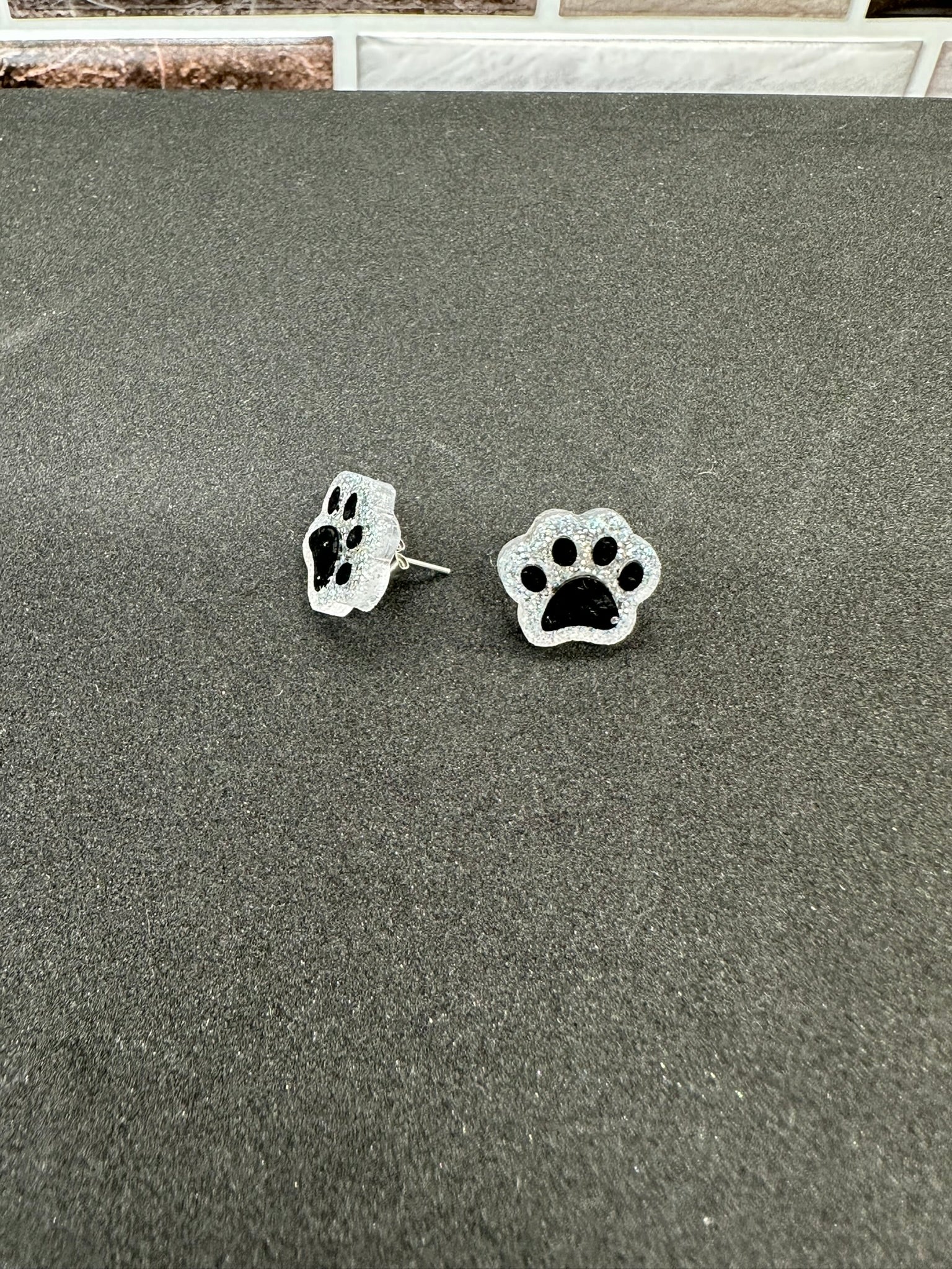Clear Glitter & Black Animal Paw Print Stud Earrings