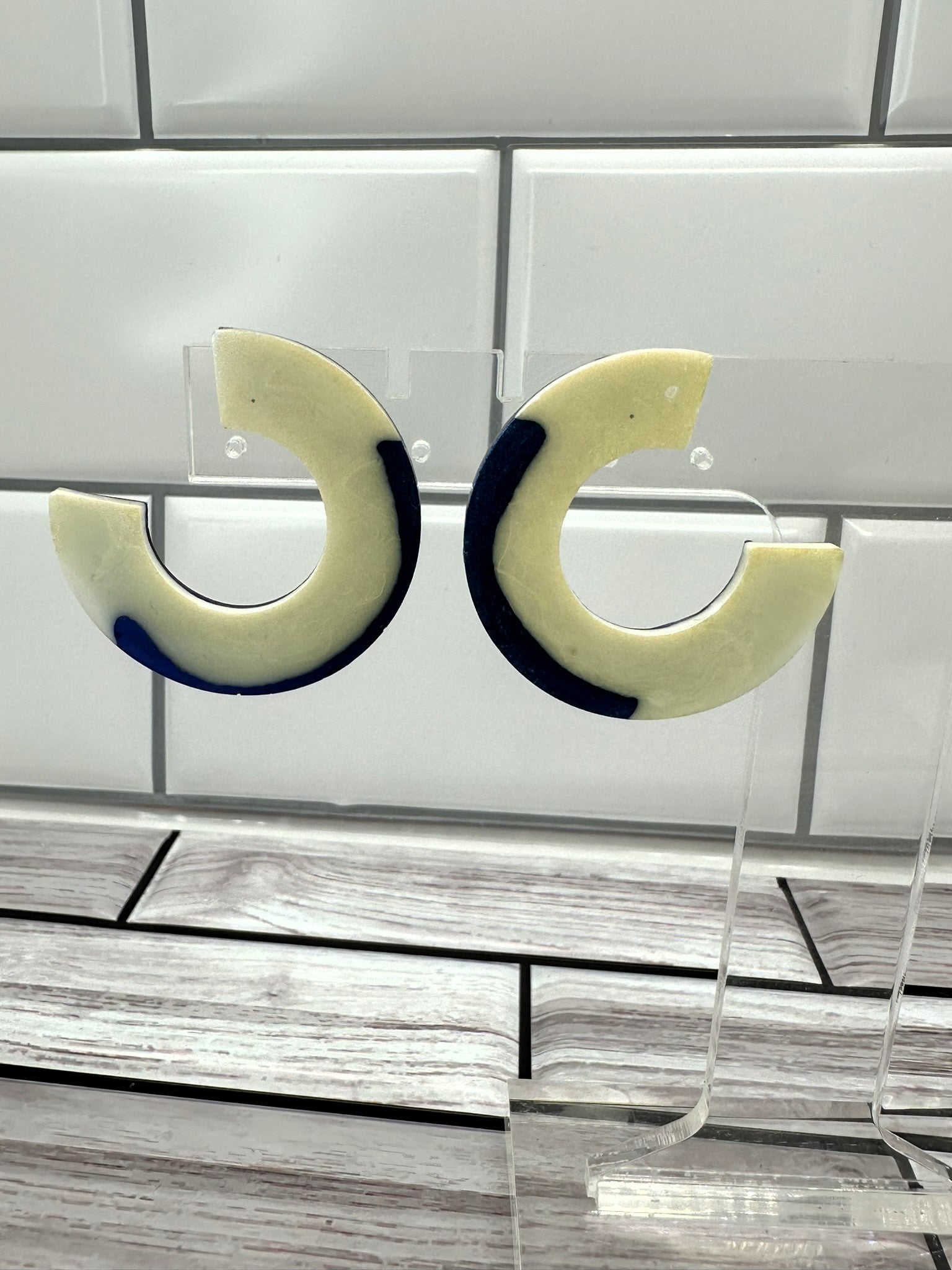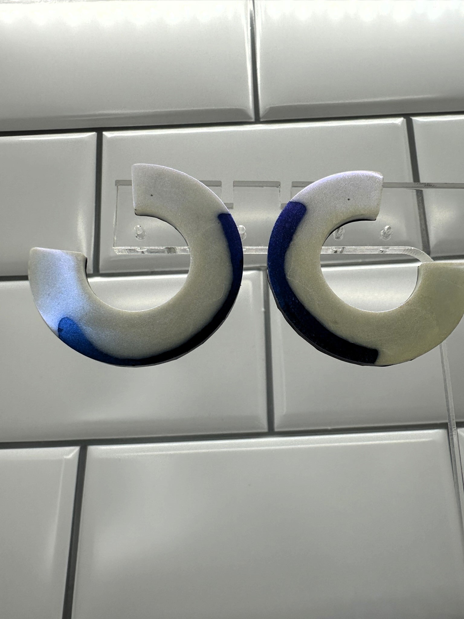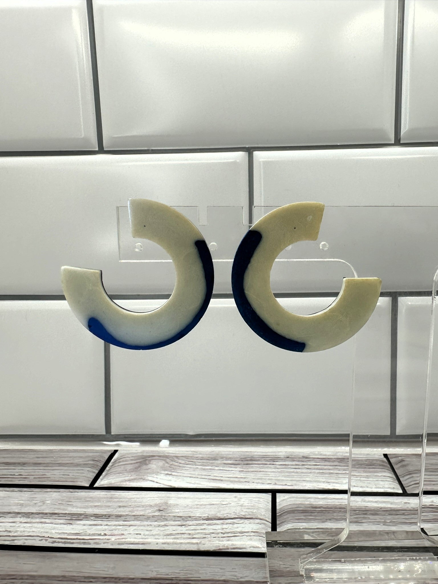 These cool earrings are a mix of blue and white colors, and they even have a little bit of yellow in them. They're shaped like the letter C and they're perfect for adding a pop of color to any outfit. You can wear them to school or when you're hanging out with friends. Plus, they're easy to put on and take off, so you won't have any trouble wearing them.