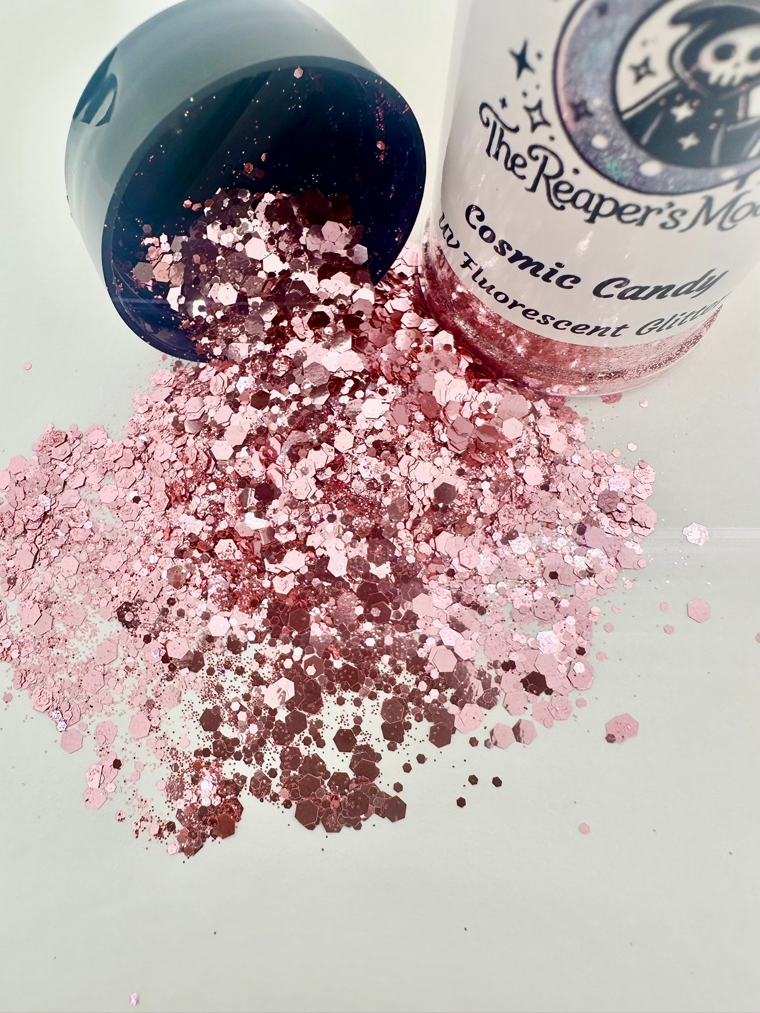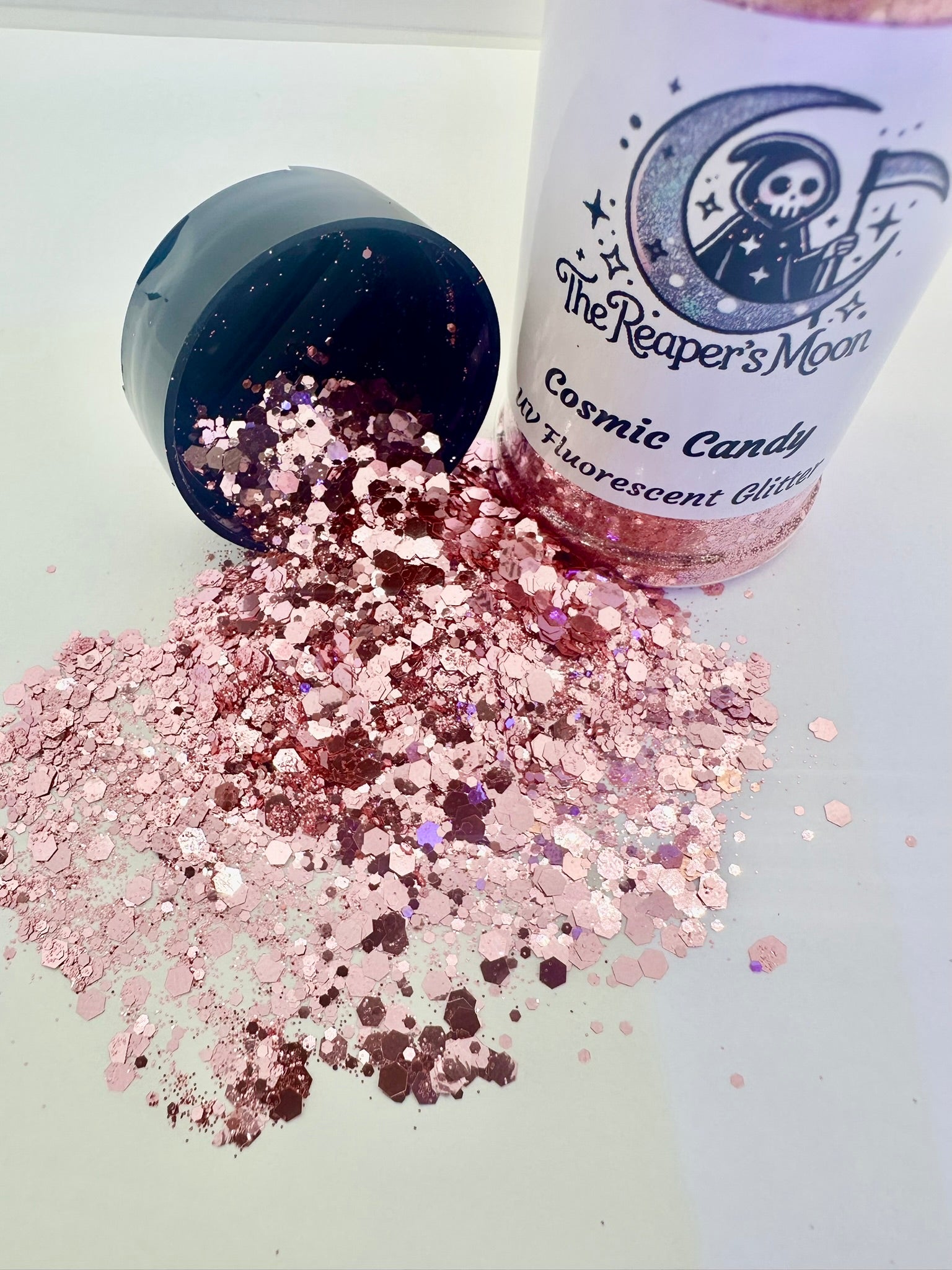 Cosmic Candy UV Fluorescent Glitter: Sweet Sparkle, Electric Glow! This chunky glitter is a sugary pink treat in daylight, then bursts with neon radiance under UV light. Get your glow on!