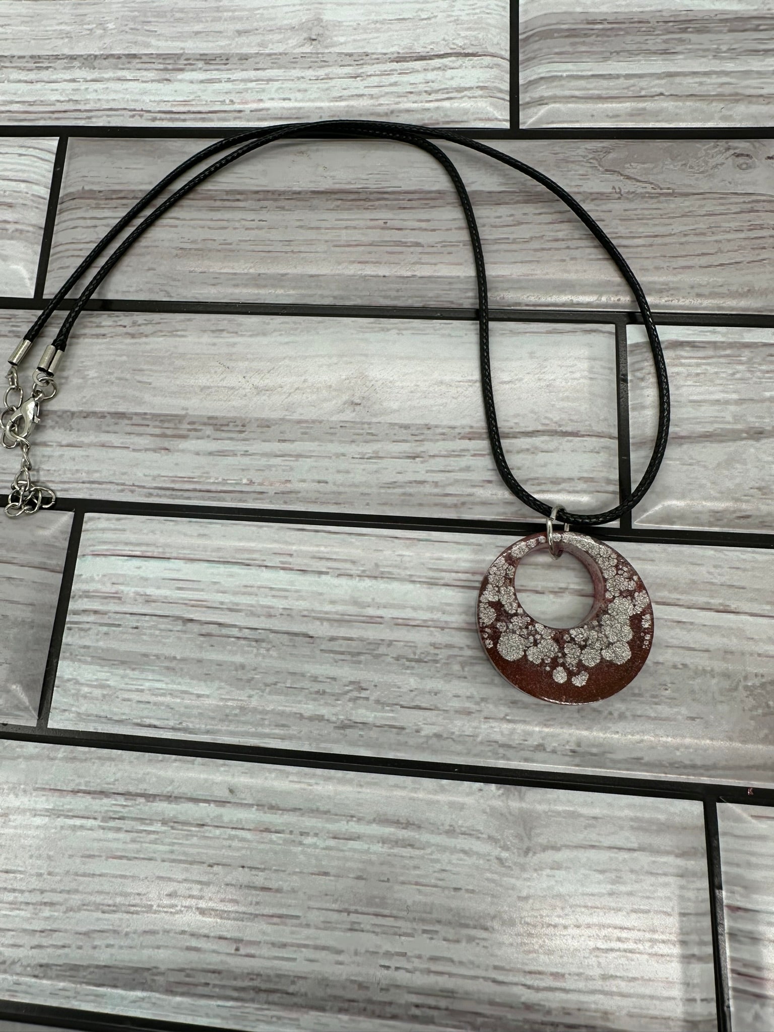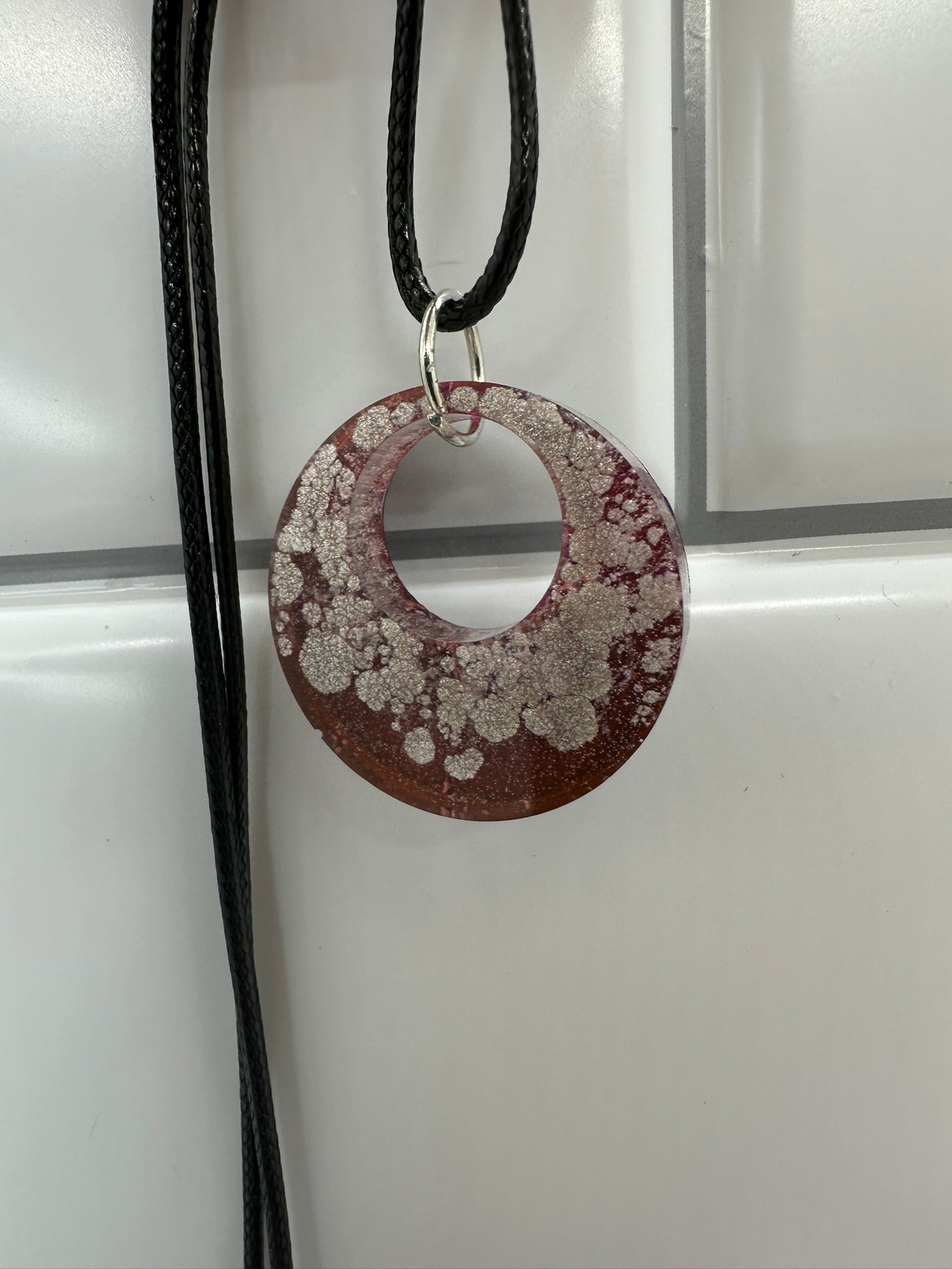Cosmic Circle: This enchanting necklace captures the magic of the cosmos. The pendant features a clear resin circle filled with shimmering silver glitter and red accents, creating a mesmerizing effect. The pendant hangs from a sleek black cord, adding a touch of sophistication. The lightweight design and comfortable cord make it perfect for everyday wear.