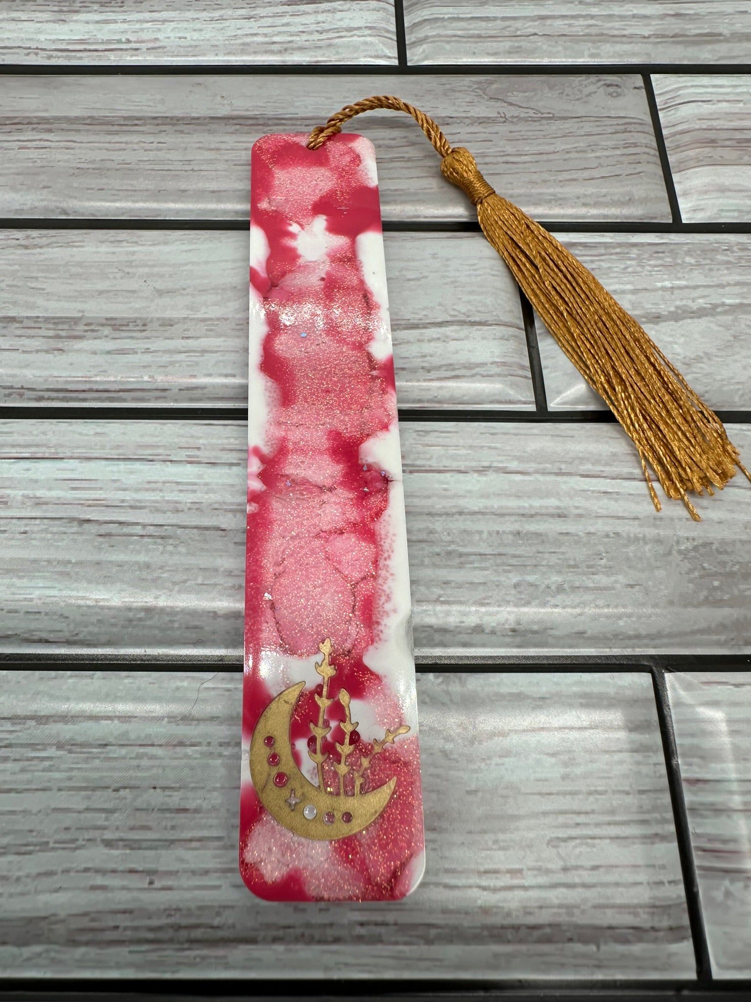 This enchanting bookmark is a must-have for any book lover who appreciates the beauty of the night sky. The bookmark features a vibrant blend of pink and white resin, creating a dreamy and ethereal effect. The design is adorned with a shimmering gold moon and stars, adding a touch of magic and whimsy. The bookmark is finished with a gold tassel, completing the celestial theme.