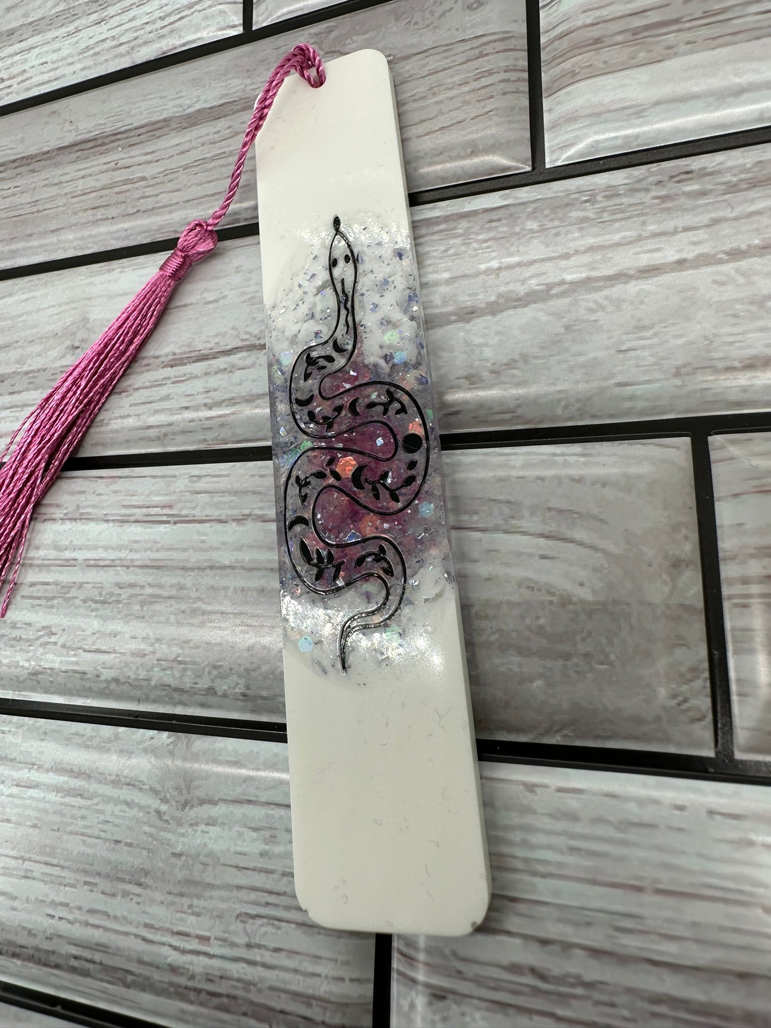 This unique and captivating bookmark is a must-have for any book lover with a love for all things mystical. The bookmark features a vibrant pink snake design, encased in crystal-clear resin, and adorned with shimmering black and silver glitter. The design is both modern and elegant, making it a perfect accessory for any book collection. The bookmark is finished with a matching pink tassel, adding a touch of whimsy and sophistication.
