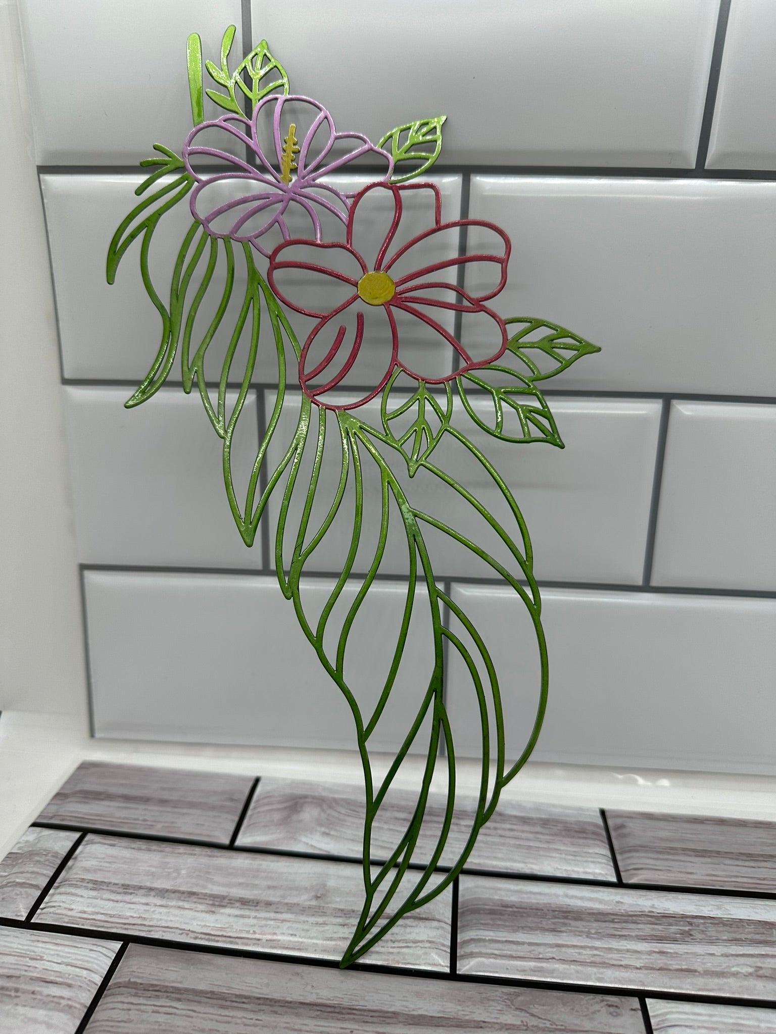 Elevate your home decor with this exquisite hand-painted metal wall art. Featuring a delicate design of vibrant hibiscus flowers, lush leaves, and intricate details, this piece is a true work of art. The intricate metalwork is meticulously painted in a stunning palette of colors, adding depth and dimension to the design.