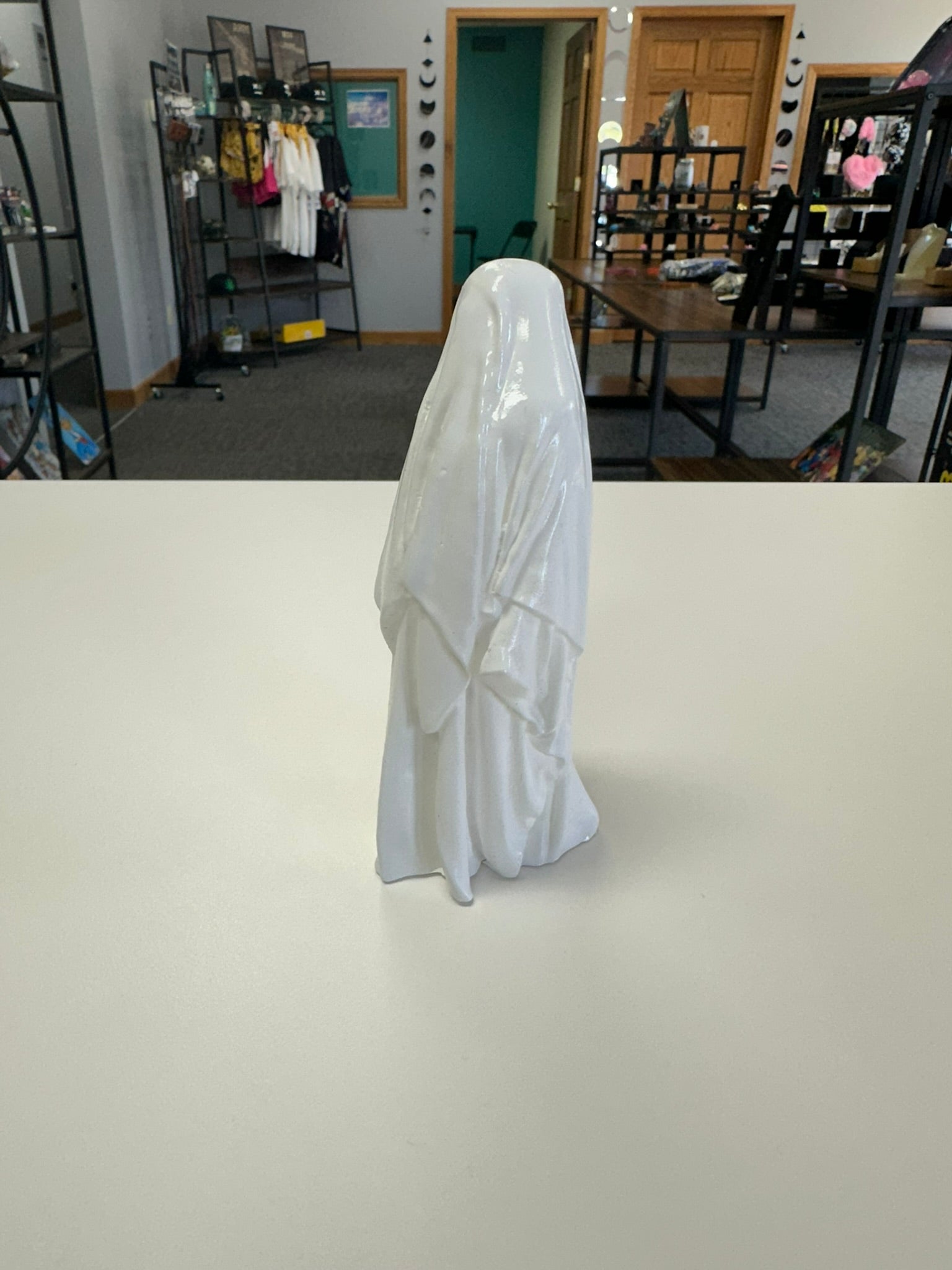 Add a touch of eerie elegance to your home decor with this ghostly figure plaster figurine. Standing tall and mysterious, this white ceramic piece is sure to capture the imagination. Its ethereal form, draped in a flowing veil, creates a haunting yet captivating presence.