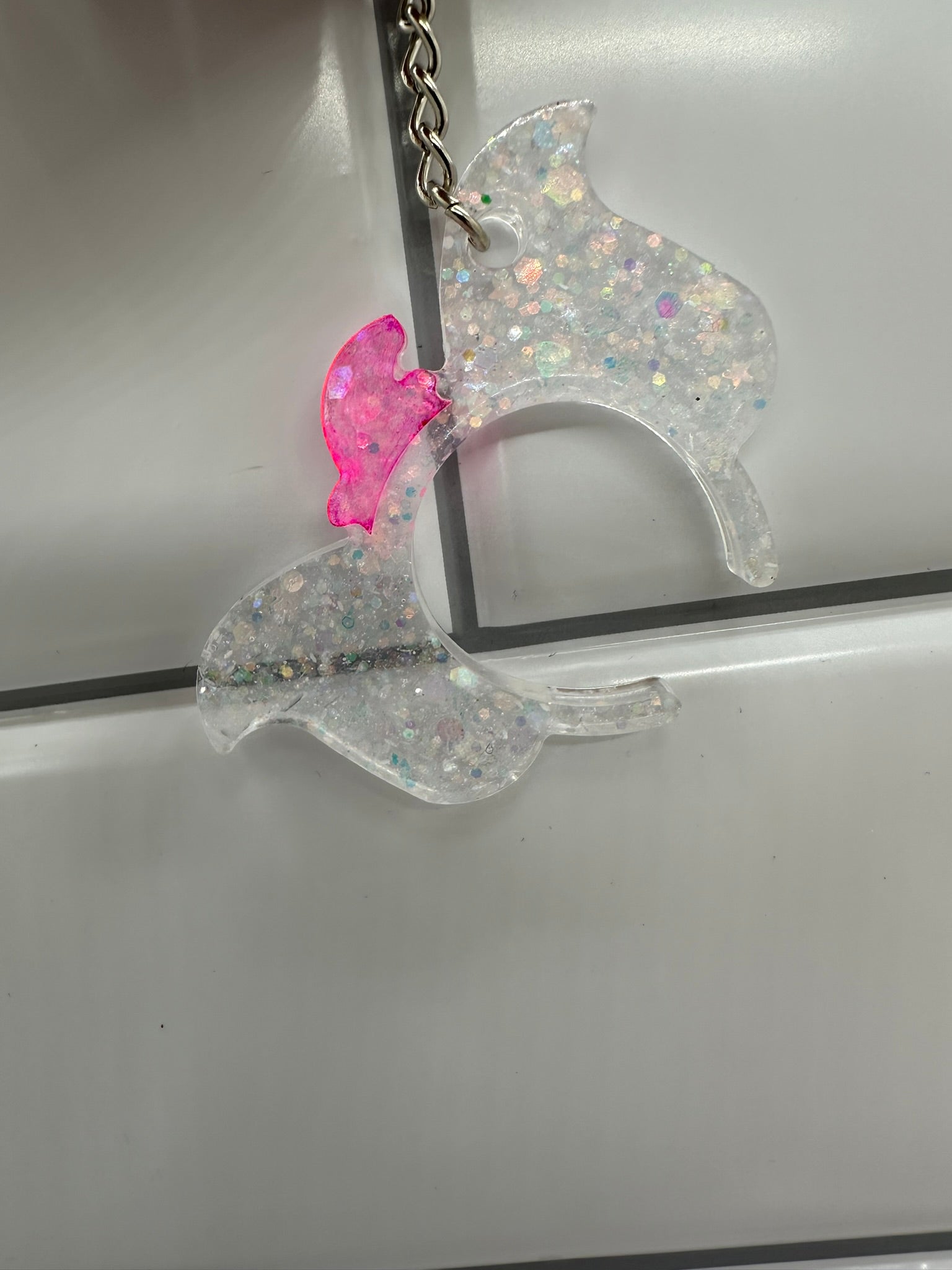 Add a touch of whimsy and sparkle to your keys with this adorable glitter and pink ear keychain. This unique and eye-catching accessory features a clear resin base adorned with shimmering glitter and a playful pink ear detail.
