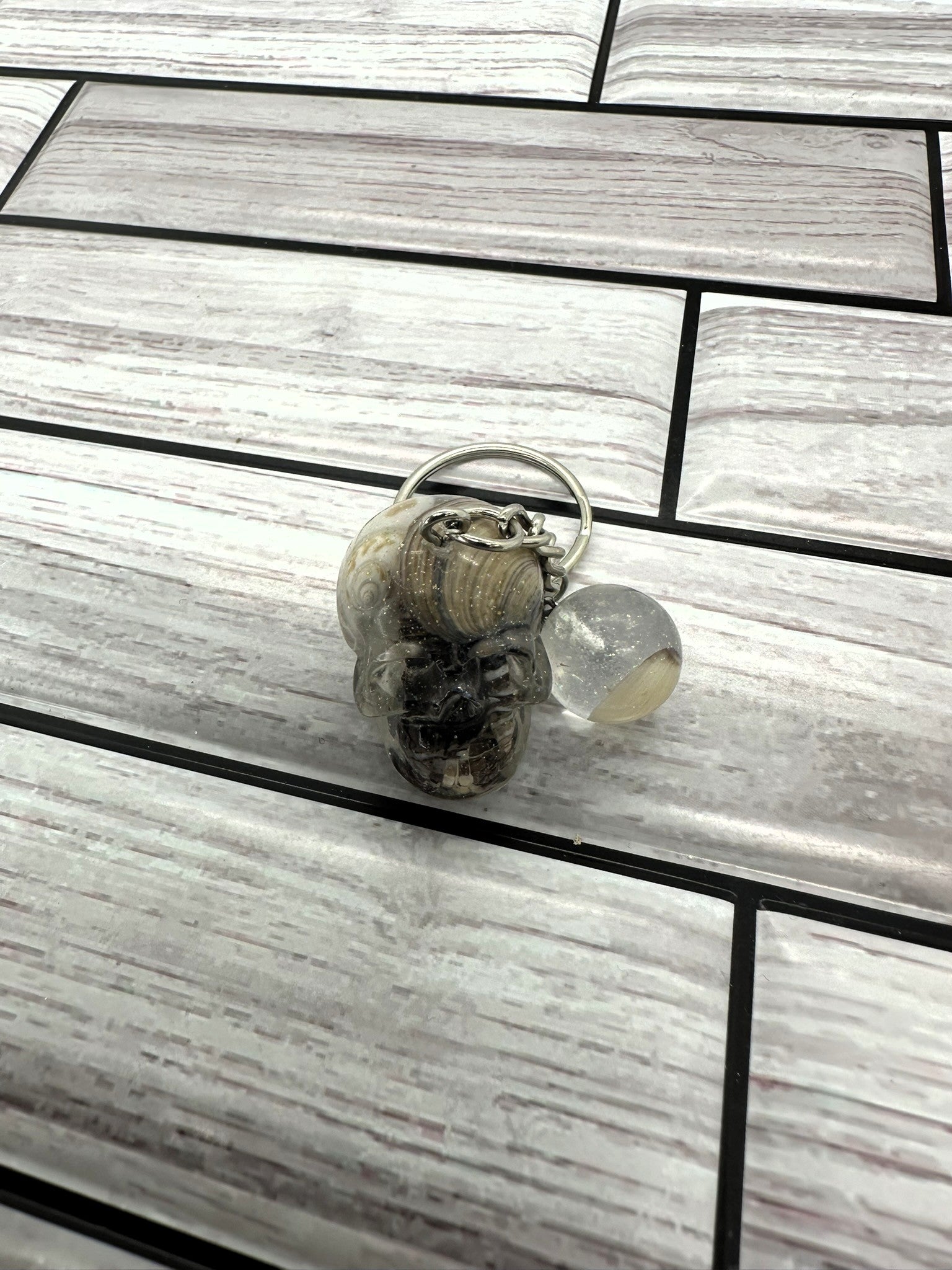 This unique and hauntingly beautiful keychain features a resin skull filled with real seashells, accented with a shimmering sphere containing a miniature seashell. This one-of-a-kind piece brings together the beauty of the ocean and the mystique of the skull, creating a truly captivating accessory. Perfect for anyone who loves the beach, gothic style, or just wants to add a touch of the unusual to their keys.
