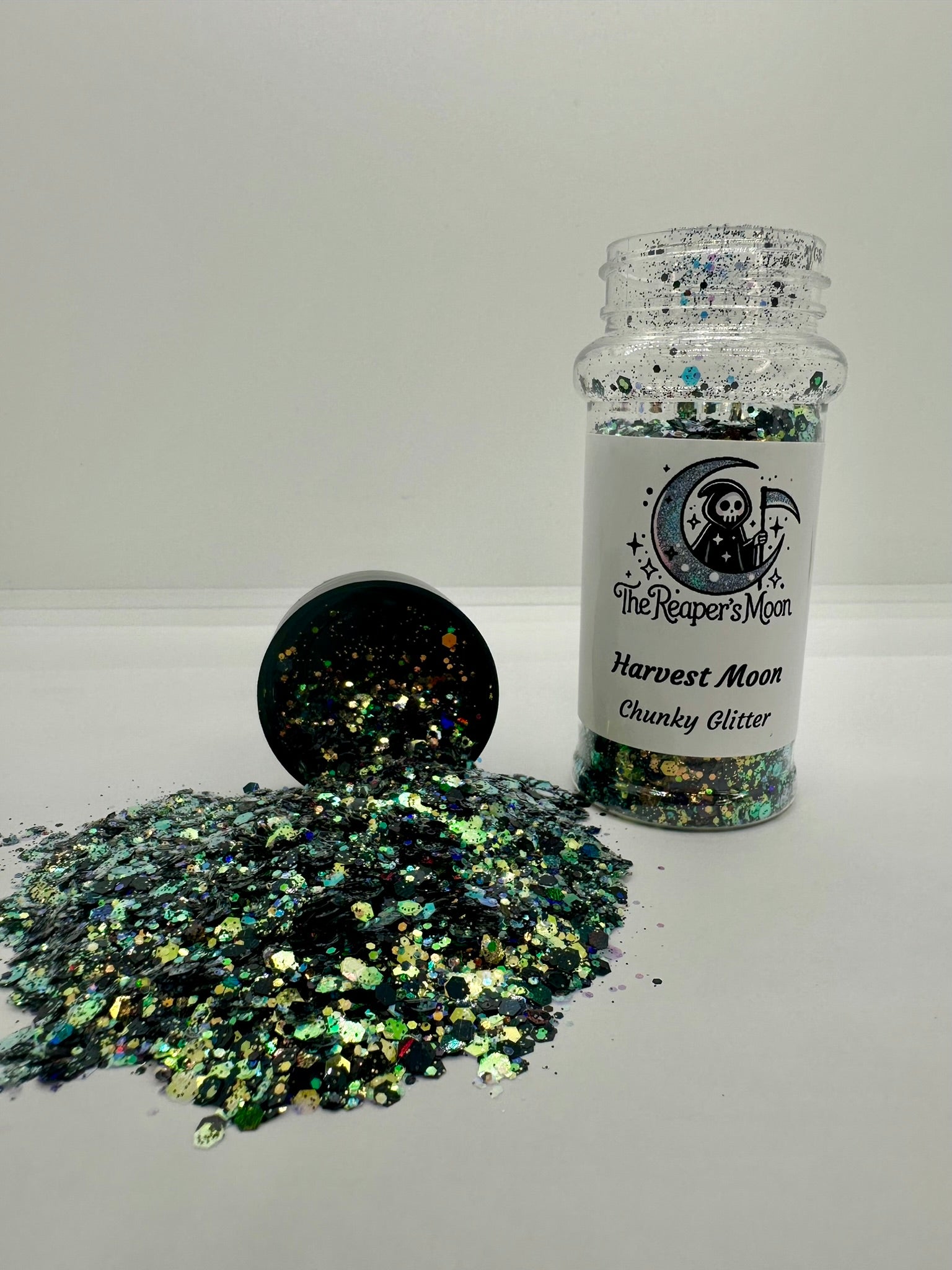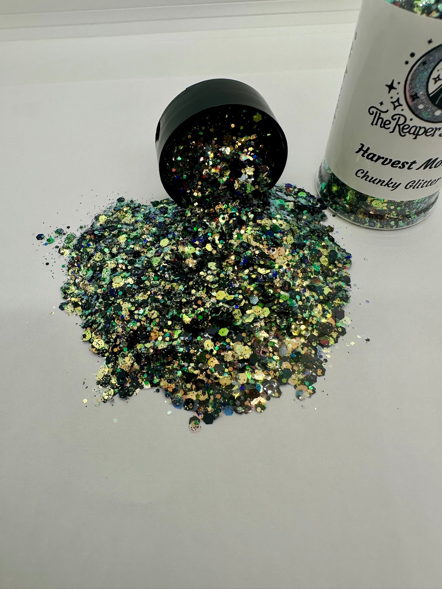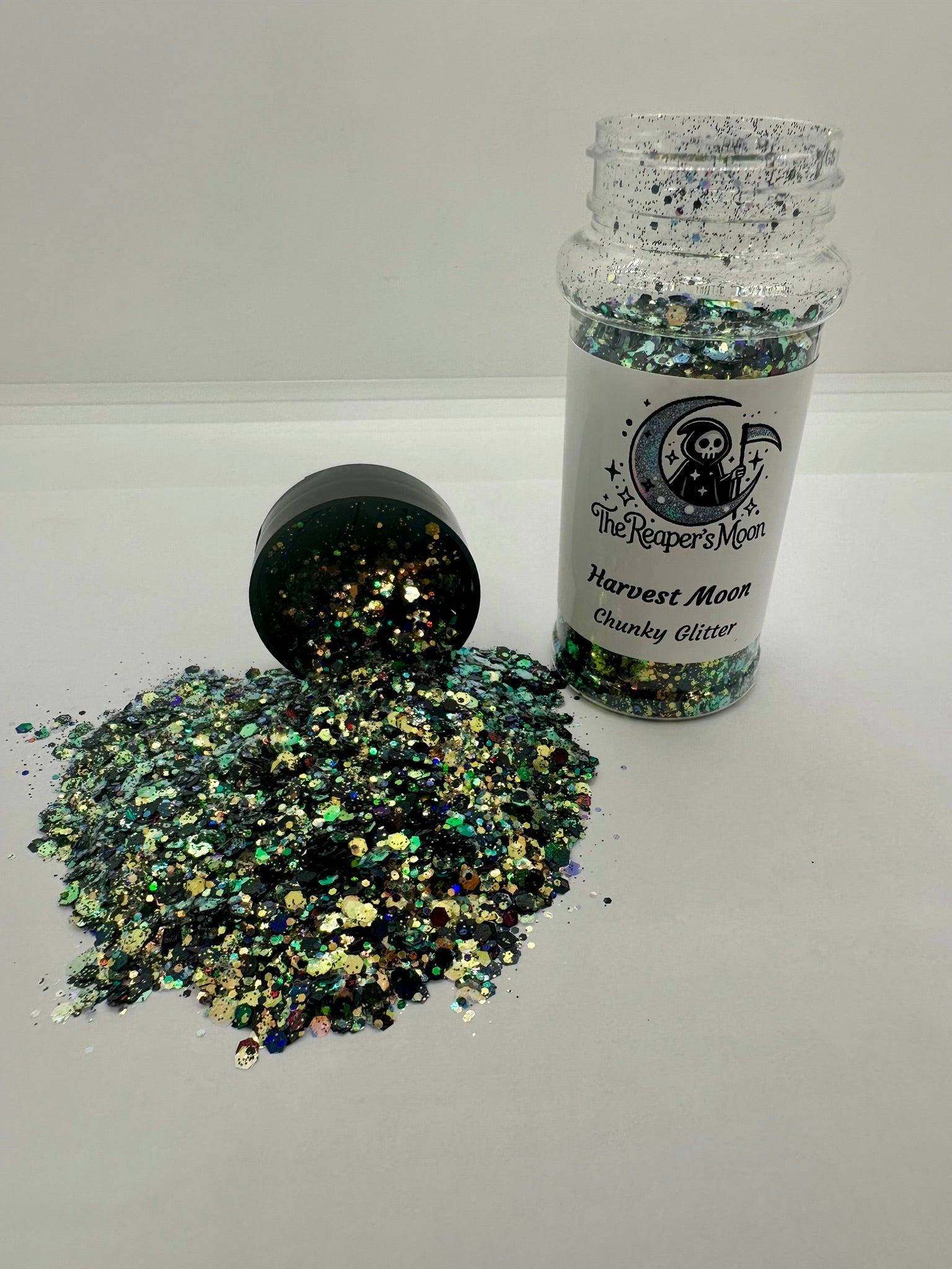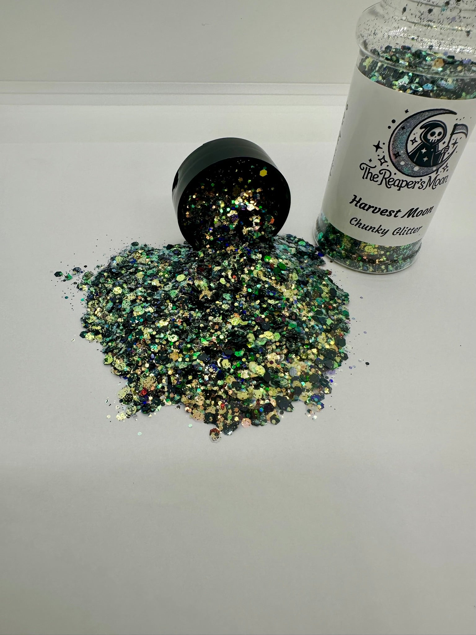 Unleash your inner magic with "Harvest Moon" chunky glitter. A mix of rich, earthy tones and captivating iridescence, this glitter captures the mystique of a moonlit harvest.