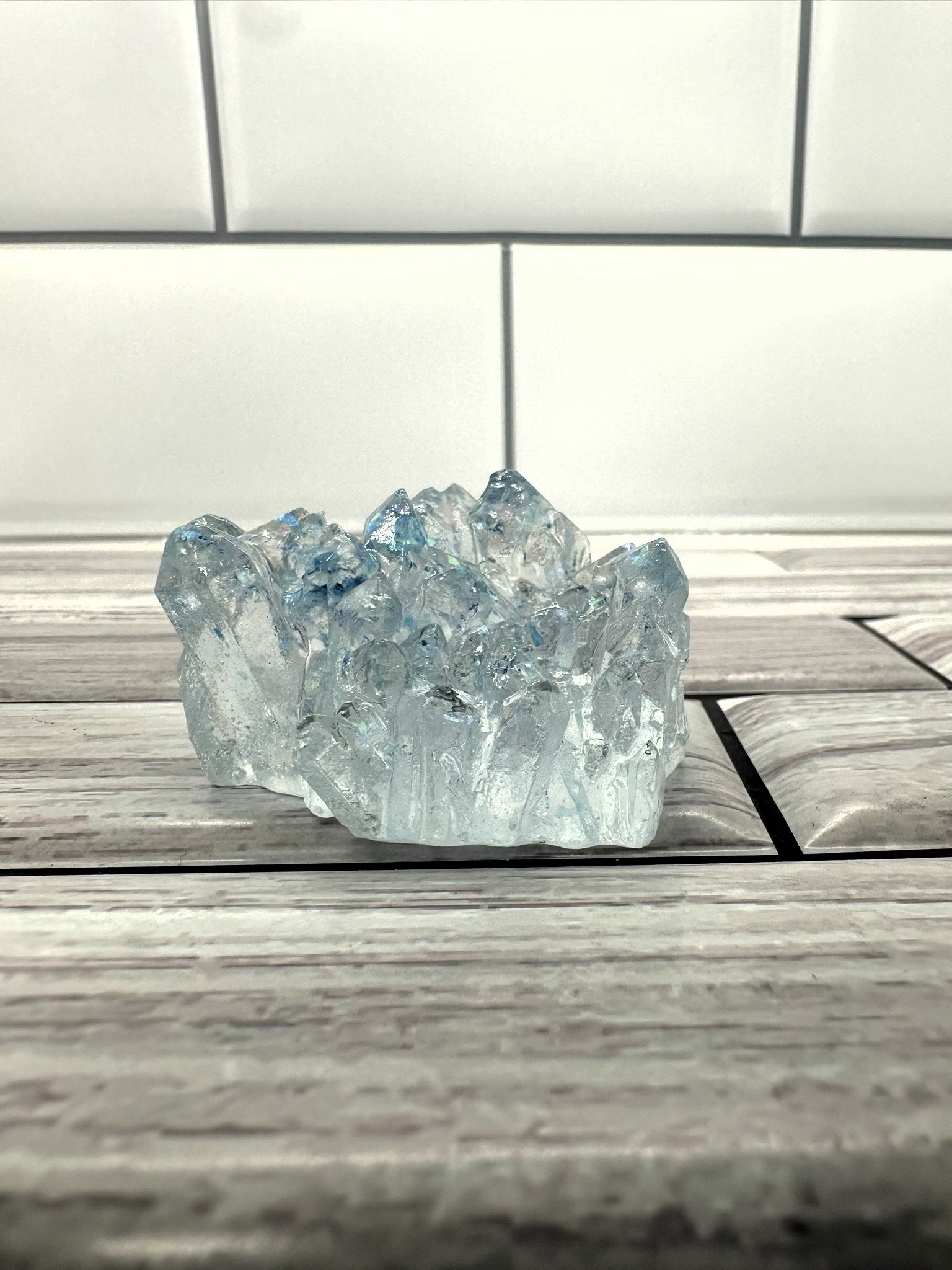 Capture the light with this mesmerizing, handmade resin crystal cluster. Meticulously cast in high-quality, water-clear epoxy resin, this piece features a jagged, realistic texture that mimics a natural geode or raw quartz formation.