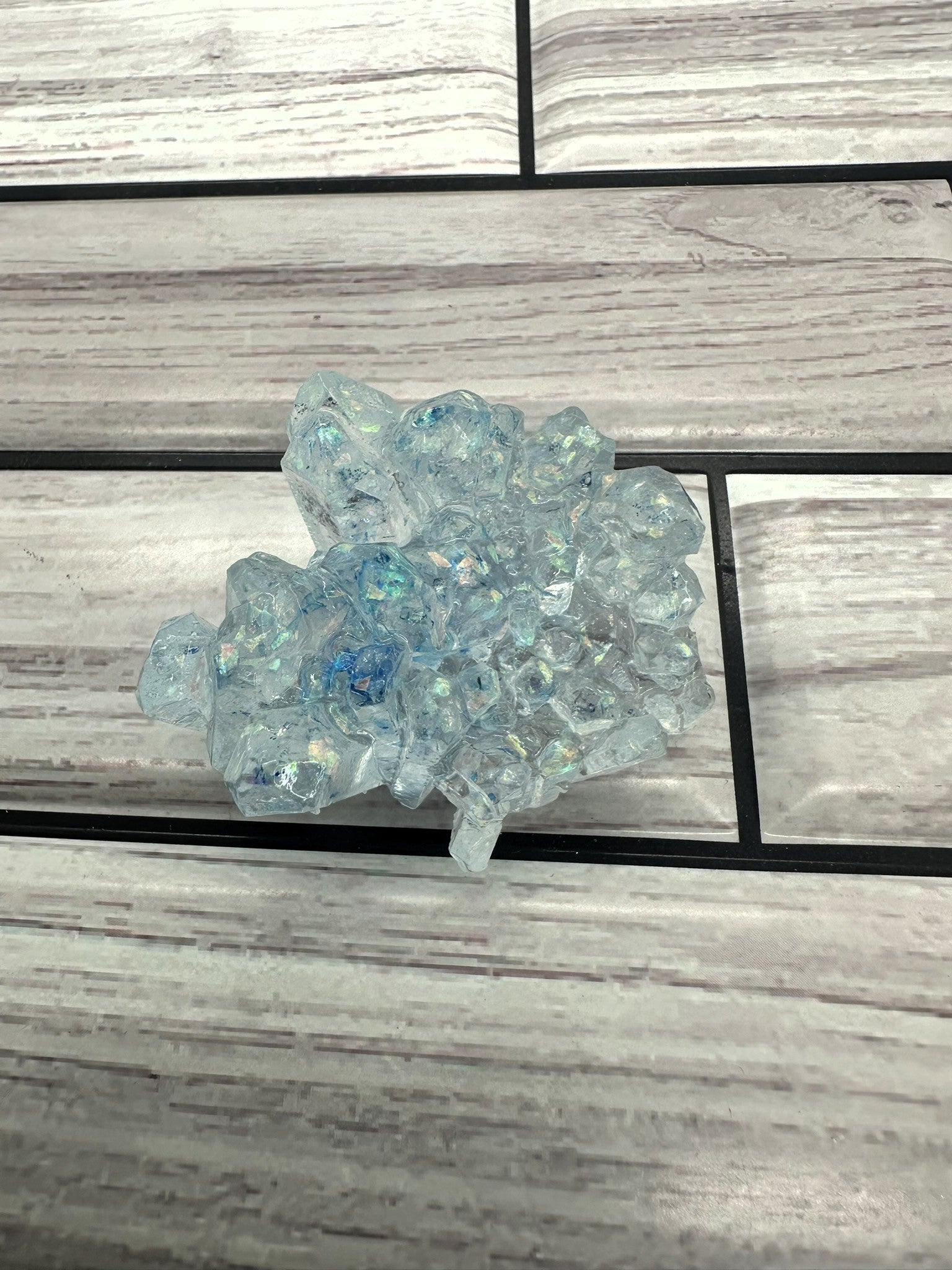 Inside the clear structure, delicate blue and holographic/iridescent flakes are suspended, catching the light to create spectacular flashes of color—like sunlight glinting off a block of ice.