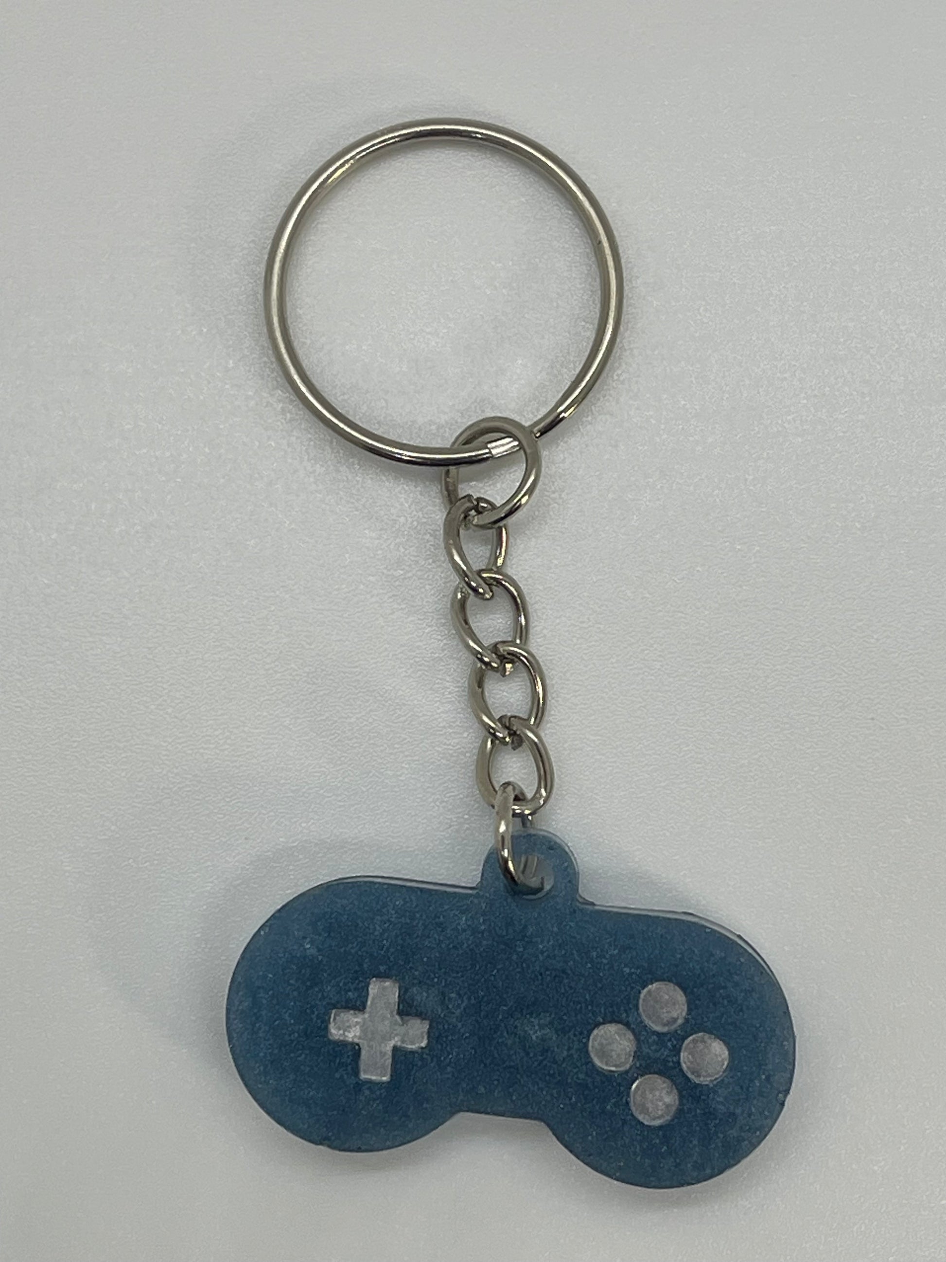 This cool keychain features a miniature game controller design in light blue and silver colors, perfect for gamers or anyone who loves technology. The detailed design includes buttons and joysticks, making it a fun accessory to add to your keys or backpack.