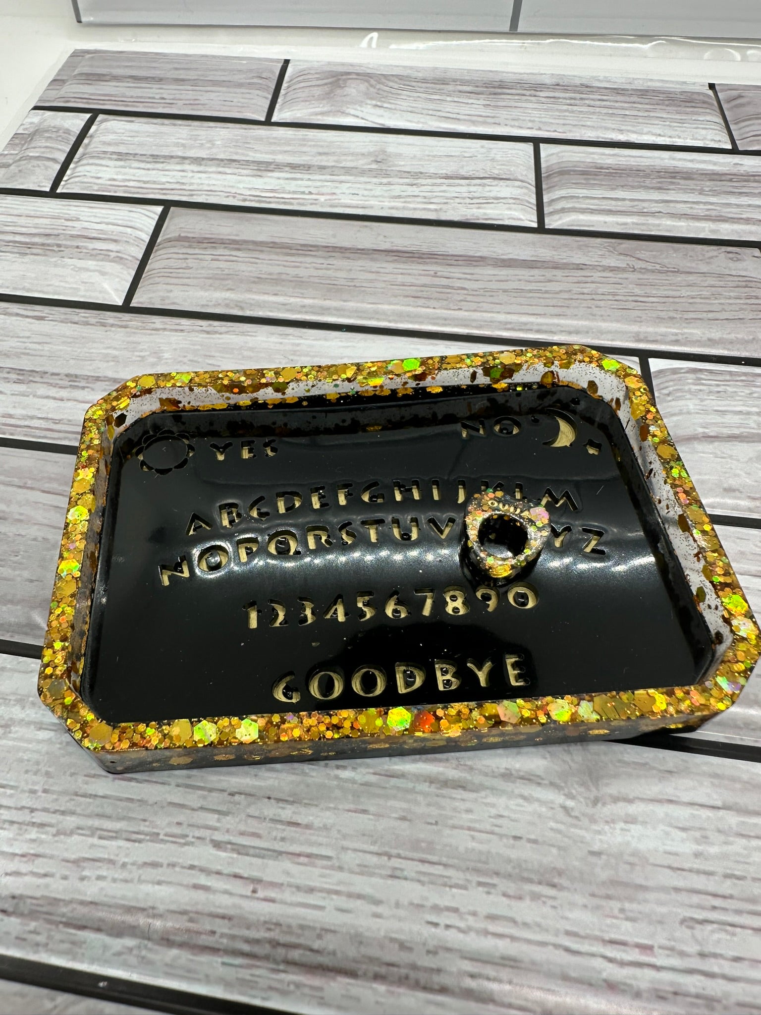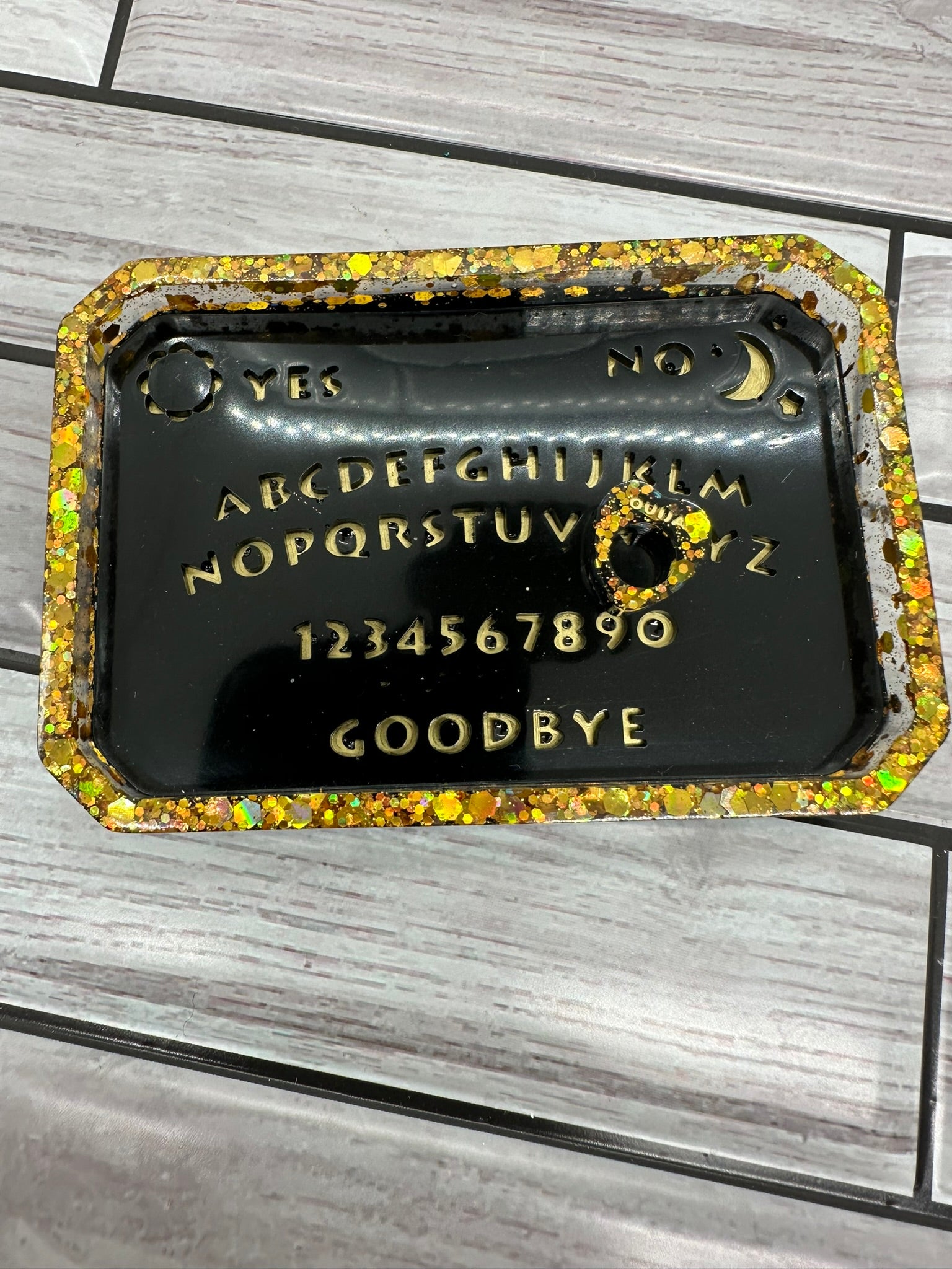 Add a touch of mystique and intrigue to your space with this stunning mini black and gold Ouija board. This handcrafted piece is perfect for displaying on a shelf, mantel, or desk. The elegant design features a black resin base with gold glitter accents and a gold-plated planchette.