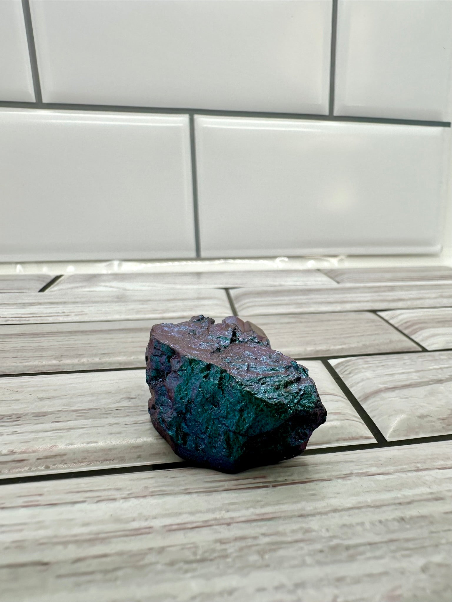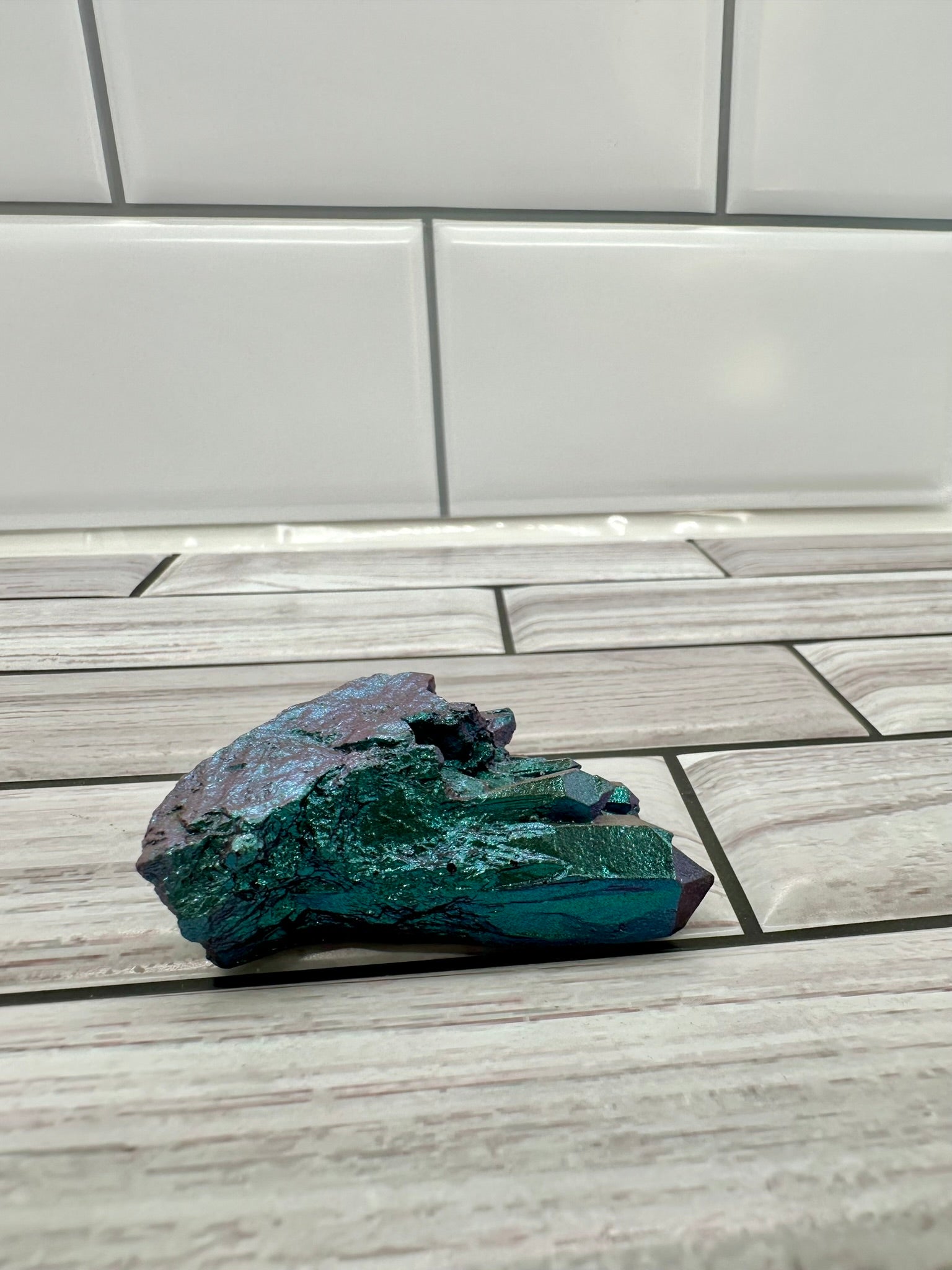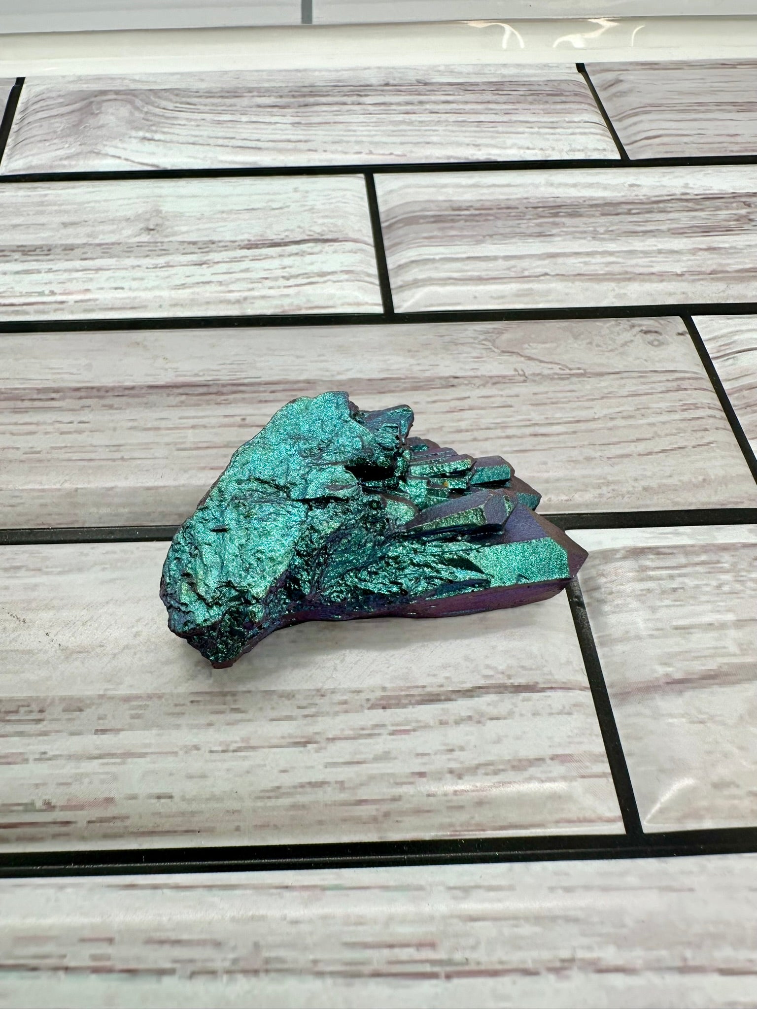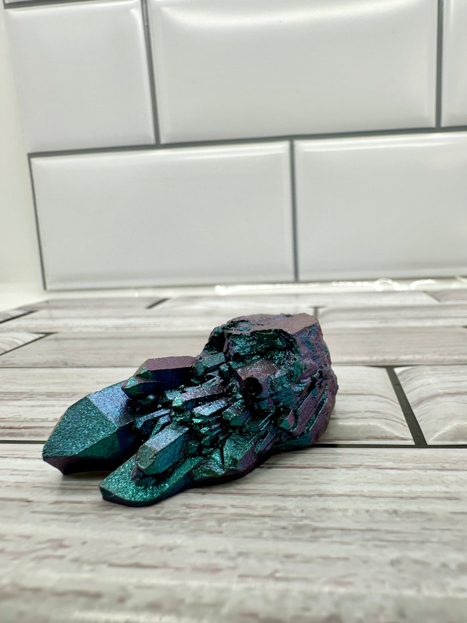 Bring a touch of enchanting allure into your home with this unique "Mystic Teal" iridescent resin crystal cluster. Handcrafted in Faribault, Minnesota, this piece captures the raw beauty of natural crystal formations with an otherworldly shimmer. The resin has been carefully cast to mimic rugged facets and points, then treated with a stunning iridescent finish that shifts from deep teal to vibrant green and hints of purple depending on the light. Perfect as a decorative accent, a unique paperweight, or a captivating addition to your curio collection.
