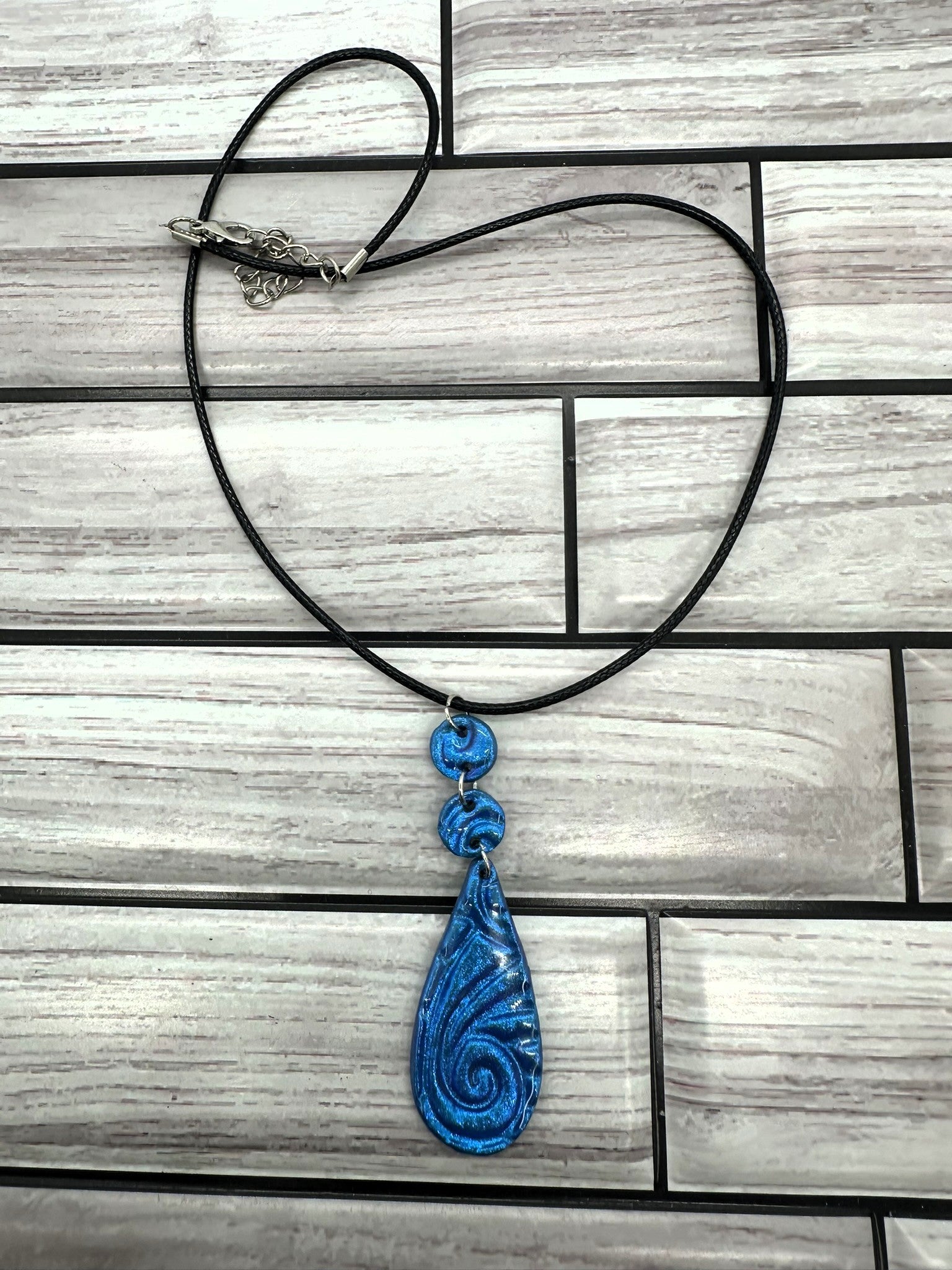 Each piece is meticulously shaped by hand, ensuring your necklace is a one-of-a-kind wearable work of art. The three-part dangle design features two smaller, round accent pieces above a dramatic teardrop pendant. The entire clay surface is finished with a high-shine, crystal-clear resin coating, which dramatically enhances the shimmer of the blue pigment and provides a durable, glossy finish.