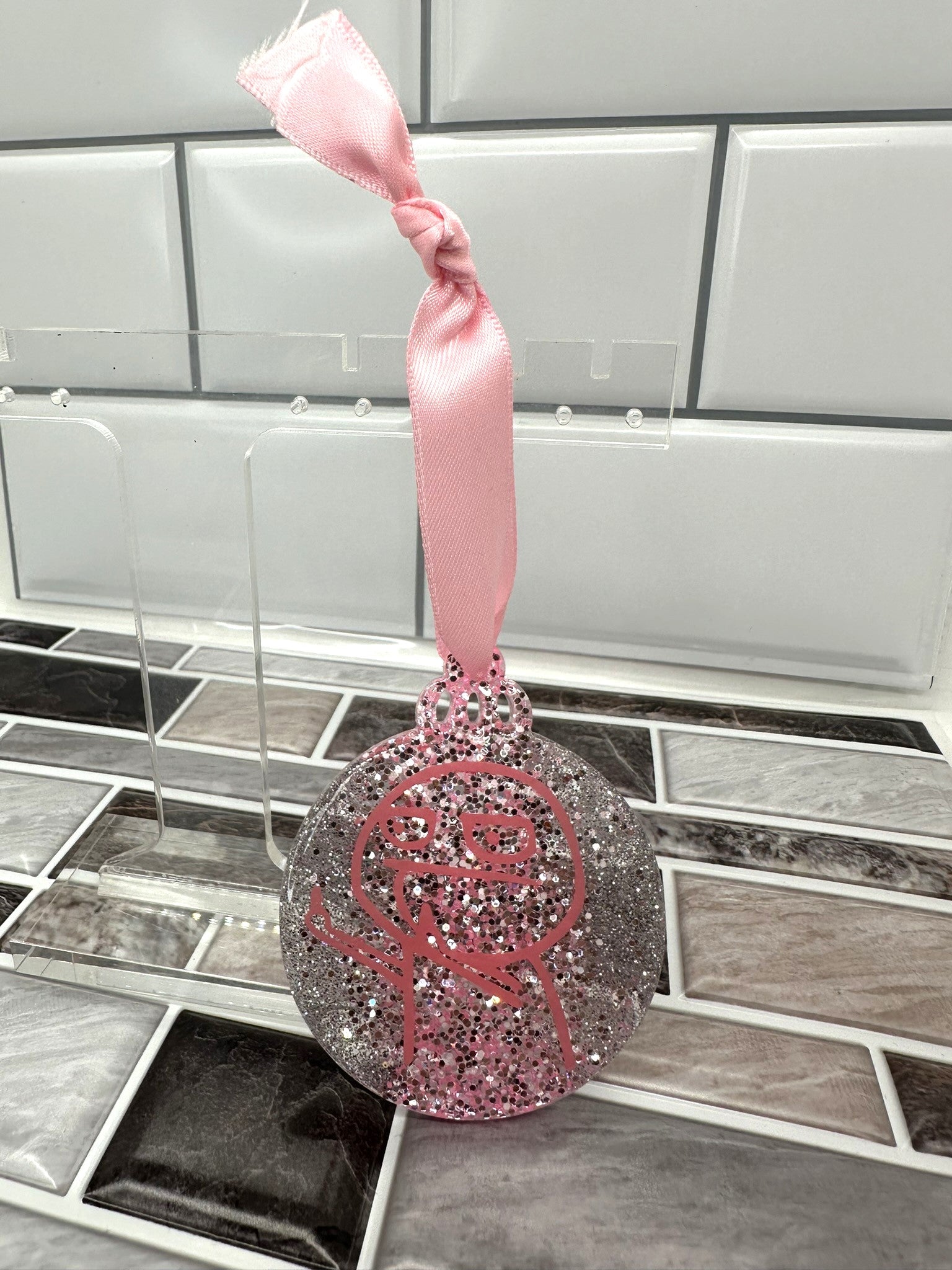 This sassy and festive ornament is perfect for adding a touch of humor to your holiday decor. The ornament features a pink and silver glitter background with a black outline of the popular "F U Guy" meme, giving it a playful and eye-catching look.