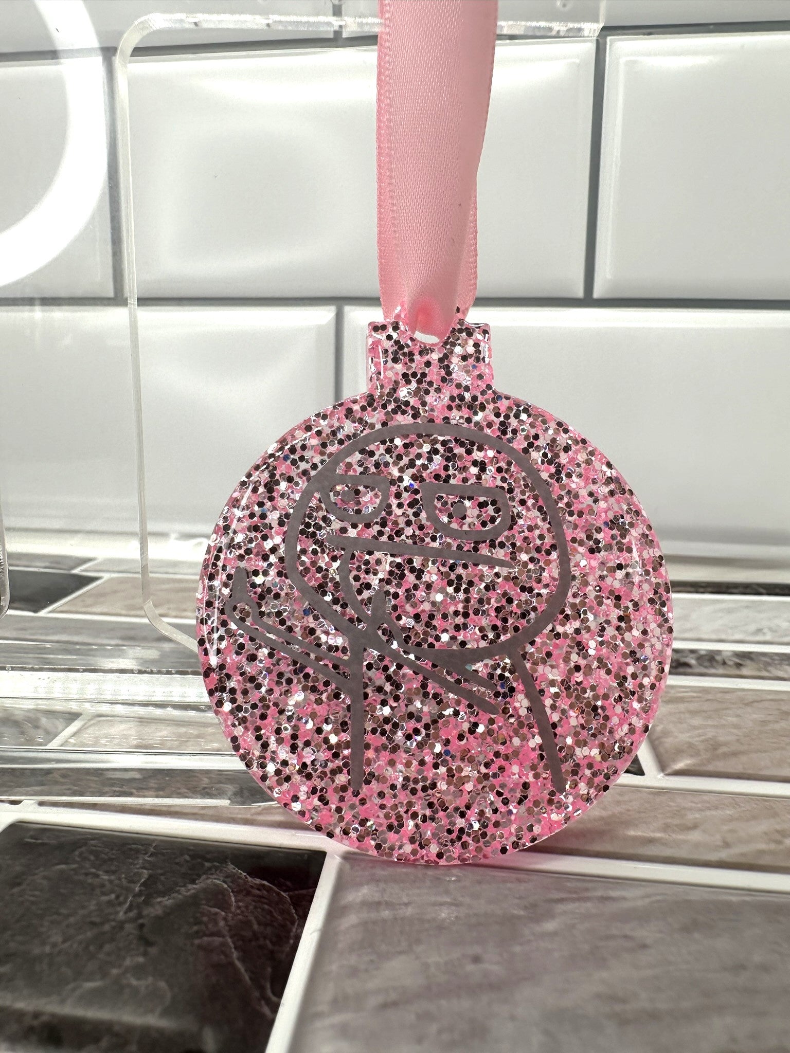 This sassy and festive ornament is perfect for adding a touch of humor to your holiday decor. The ornament features a pink and silver glitter background with a silver outline of the popular "F U Guy" meme, giving it a playful and eye-catching look.