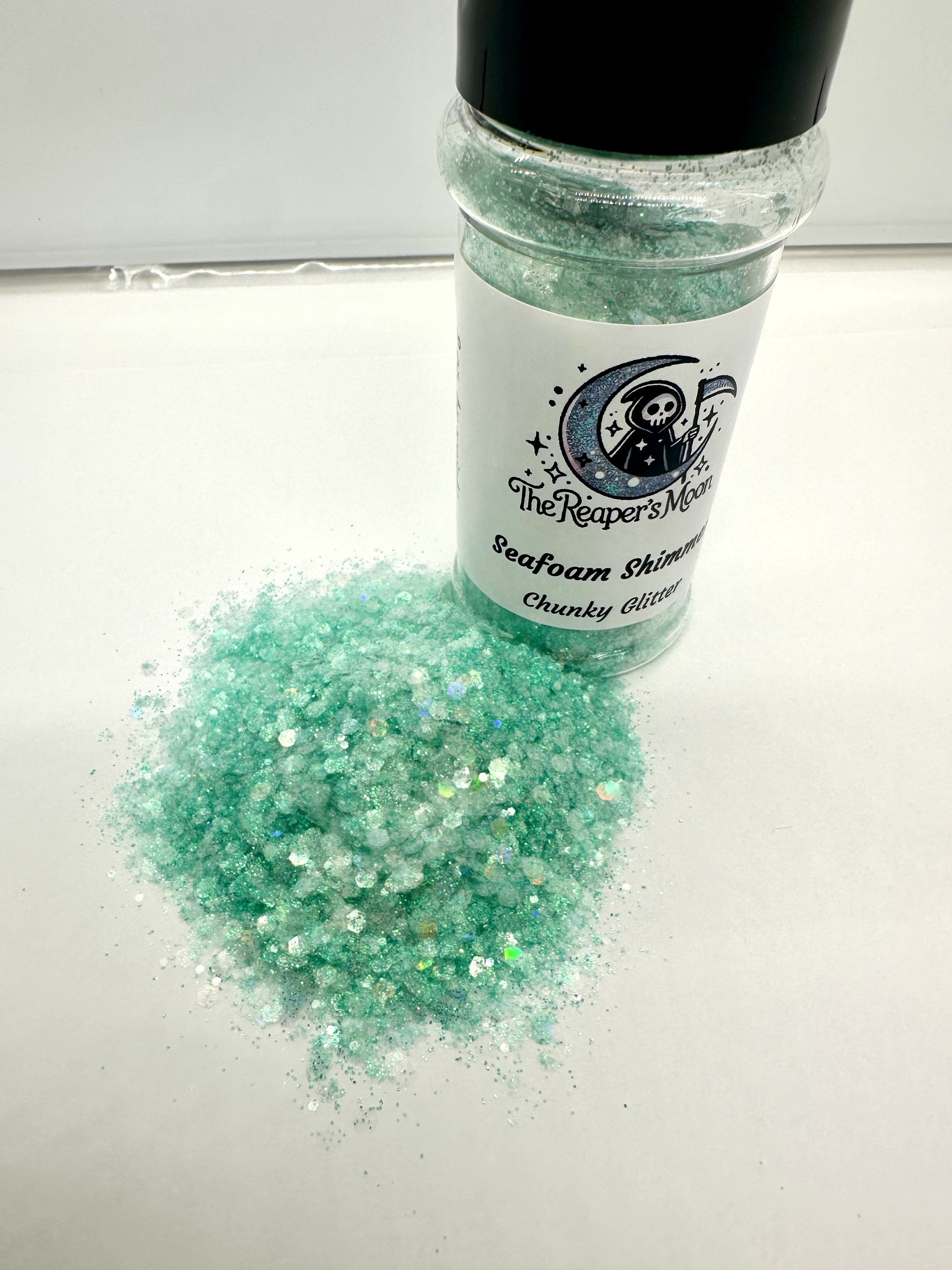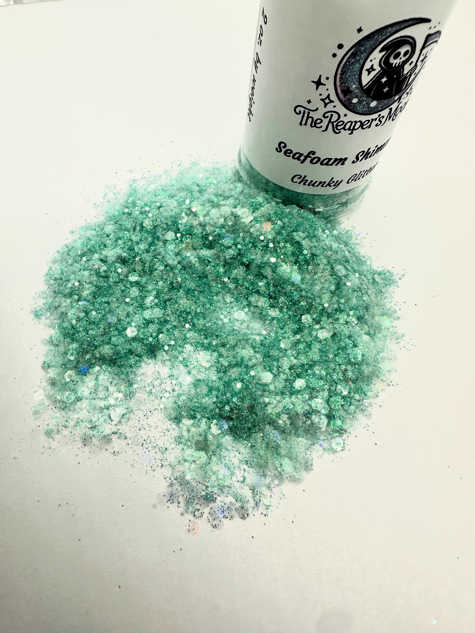 Capture the essence of a serene tropical escape with Seafoam Shimmer, a premium chunky glitter from The Reaper’s Moon. This enchanting blend features a mix of translucent sea-glass greens, iridescent flakes, and holographic highlights that shift like sunlight dancing on ocean waves.