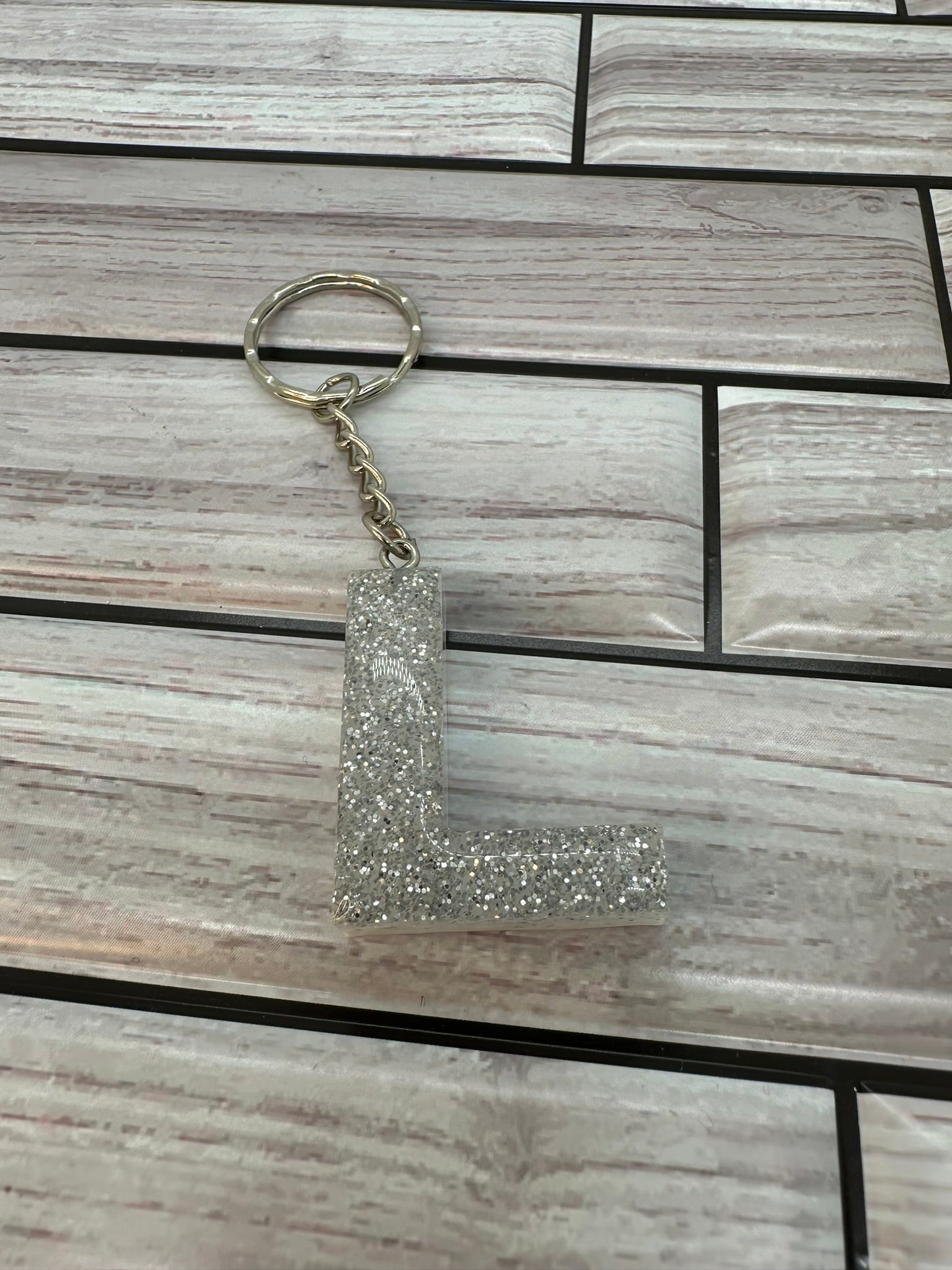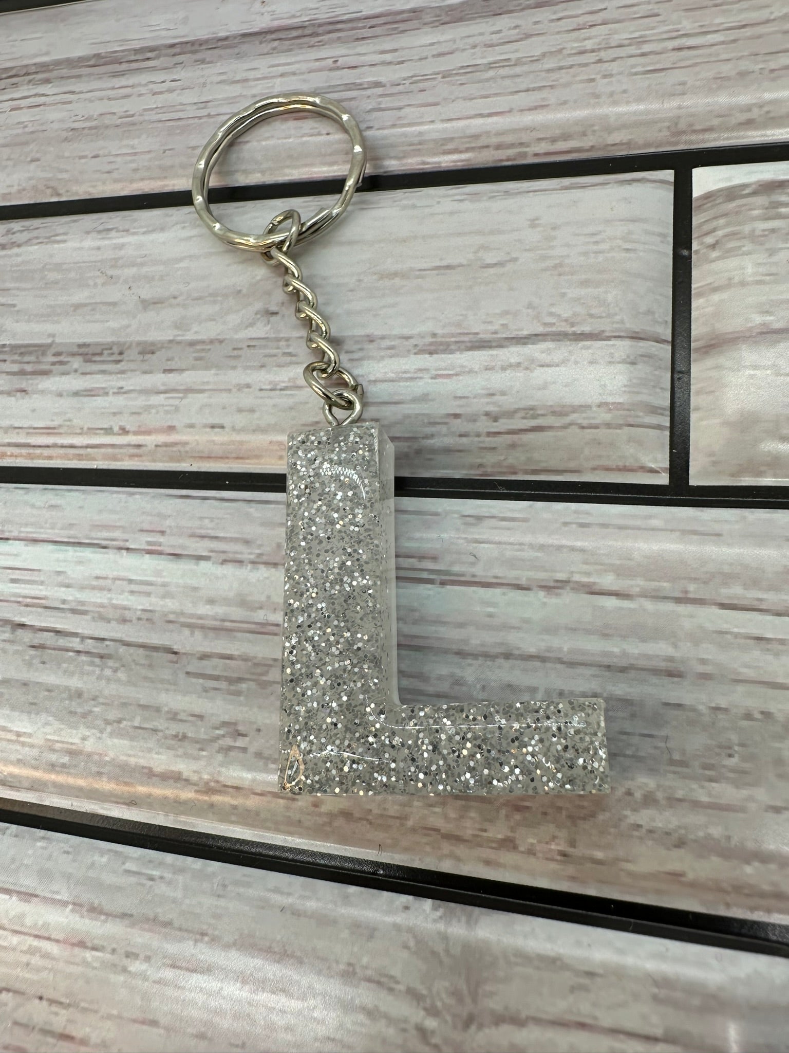 Keep your keys organized and stylish with this silver glitter resin letter L keychain.