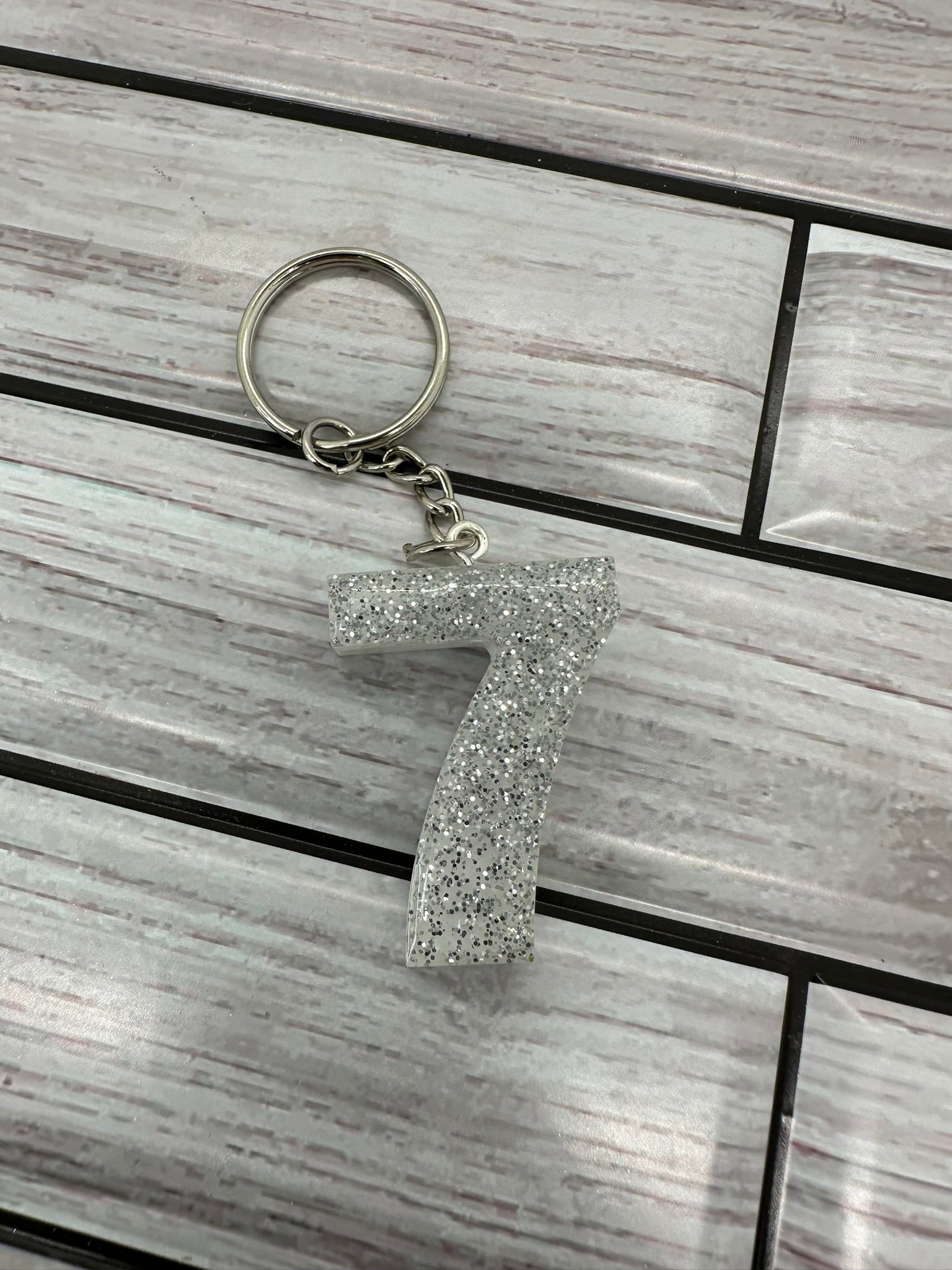 This eye-catching resin keychain features the number "7" in a beautiful white and silver glitter design. The glitter is embedded within the resin, creating a dazzling and textured effect. The keychain is a perfect accessory for adding a touch of personality to your keys or bag.
