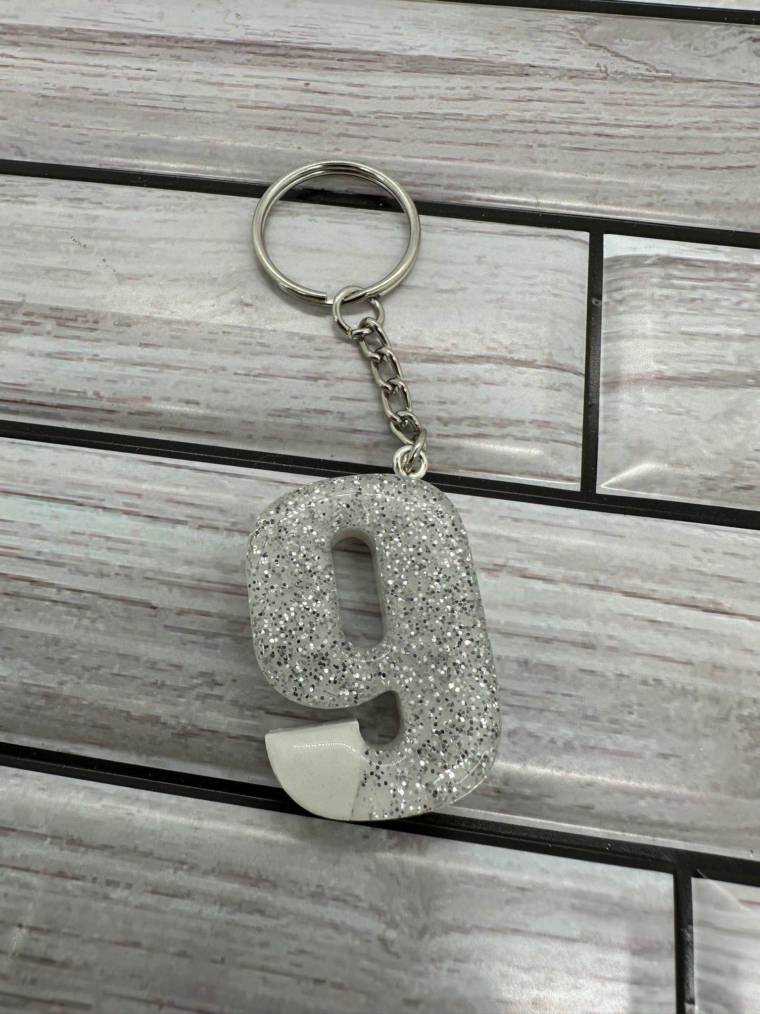 This eye-catching resin keychain features the number "9" in a beautiful white and silver glitter design. The glitter is embedded within the resin, creating a dazzling and textured effect. The keychain is a perfect accessory for adding a touch of personality to your keys or bag.