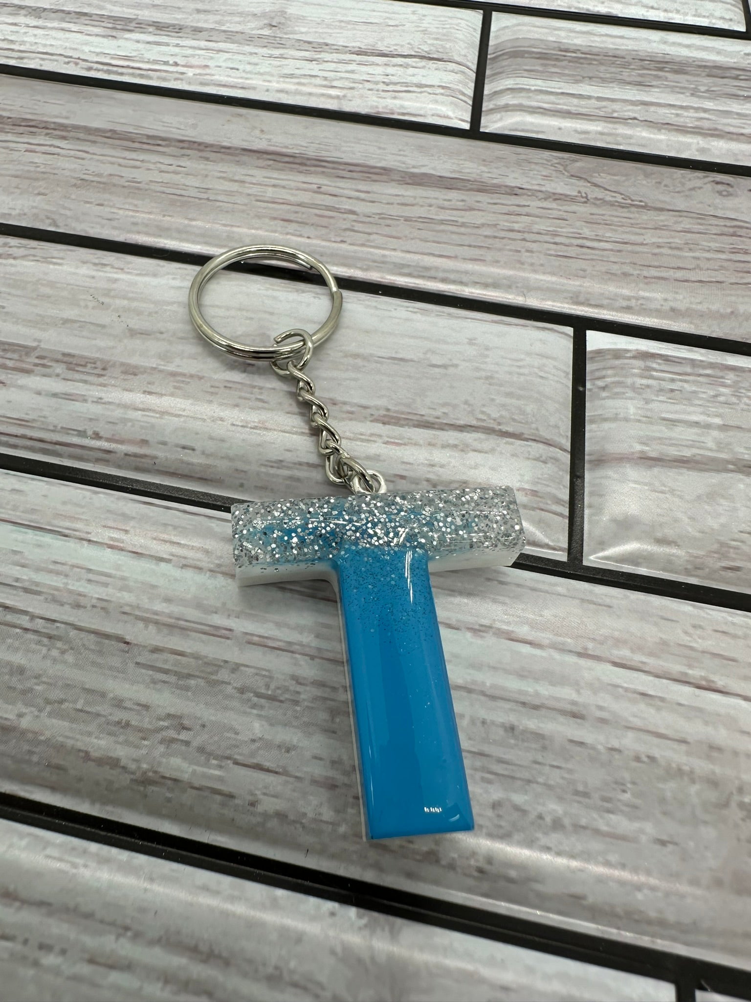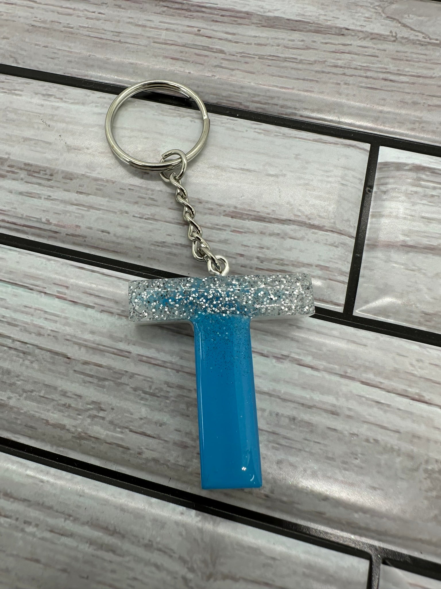 This eye-catching resin keychain features the letter "T" in a vibrant shade of blue, accented with shimmering silver glitter. The glitter is embedded within the resin, creating a dazzling and textured effect. The keychain is a perfect accessory for adding a touch of personality to your keys or bag.