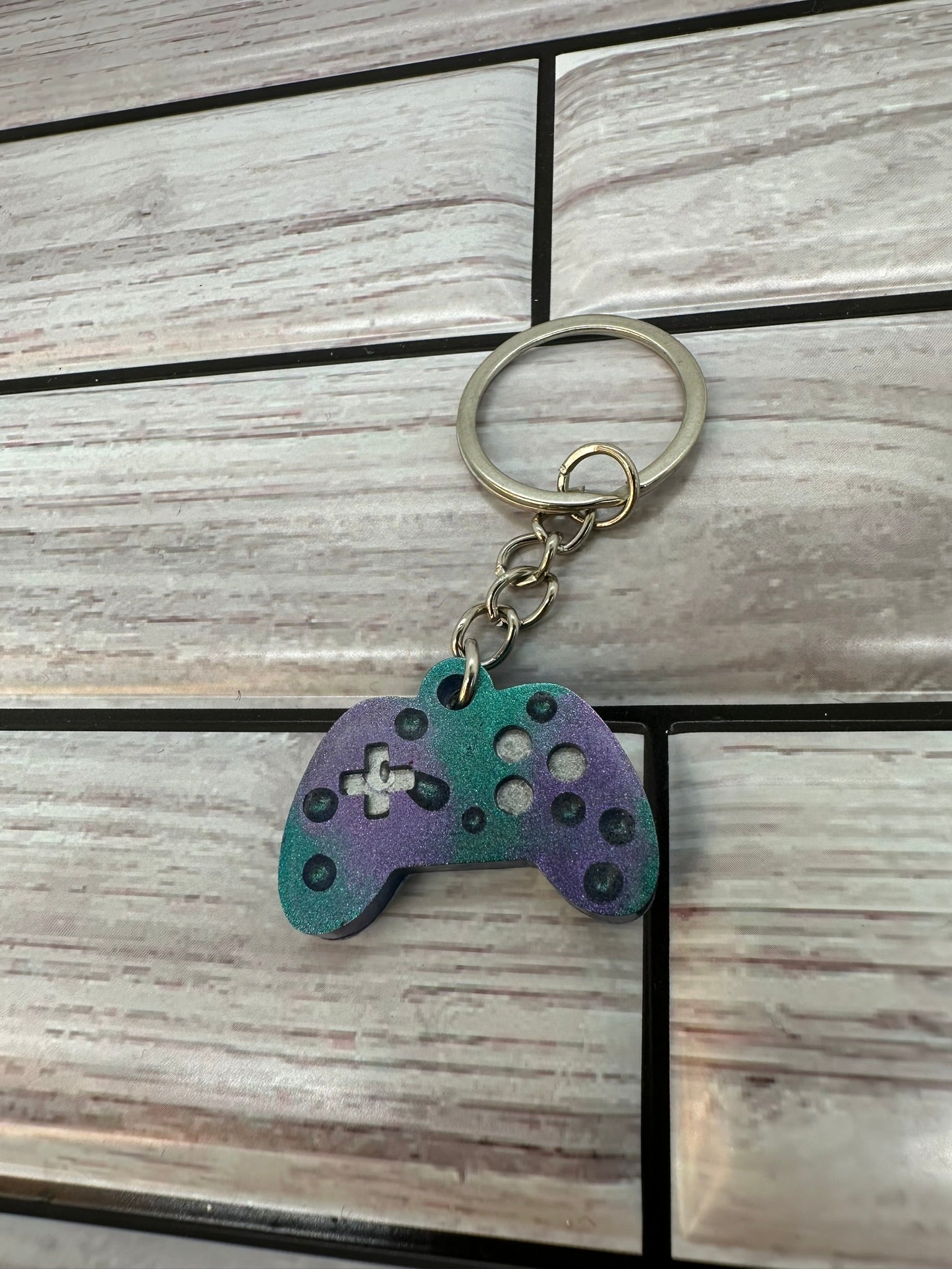- Purple and teal game controller design: Show off your love for gaming with this trendy keychain.