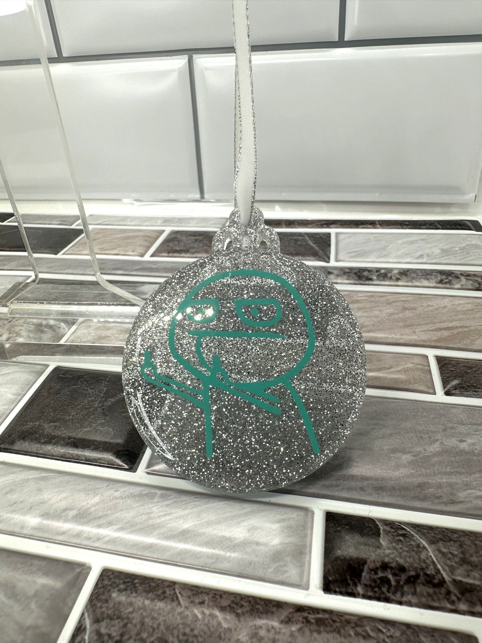 This sassy and festive ornament is perfect for adding a touch of humor to your holiday decor. The ornament features a silver glitter background with a teal outline of the popular "F U Guy" meme, giving it a playful and eye-catching look.