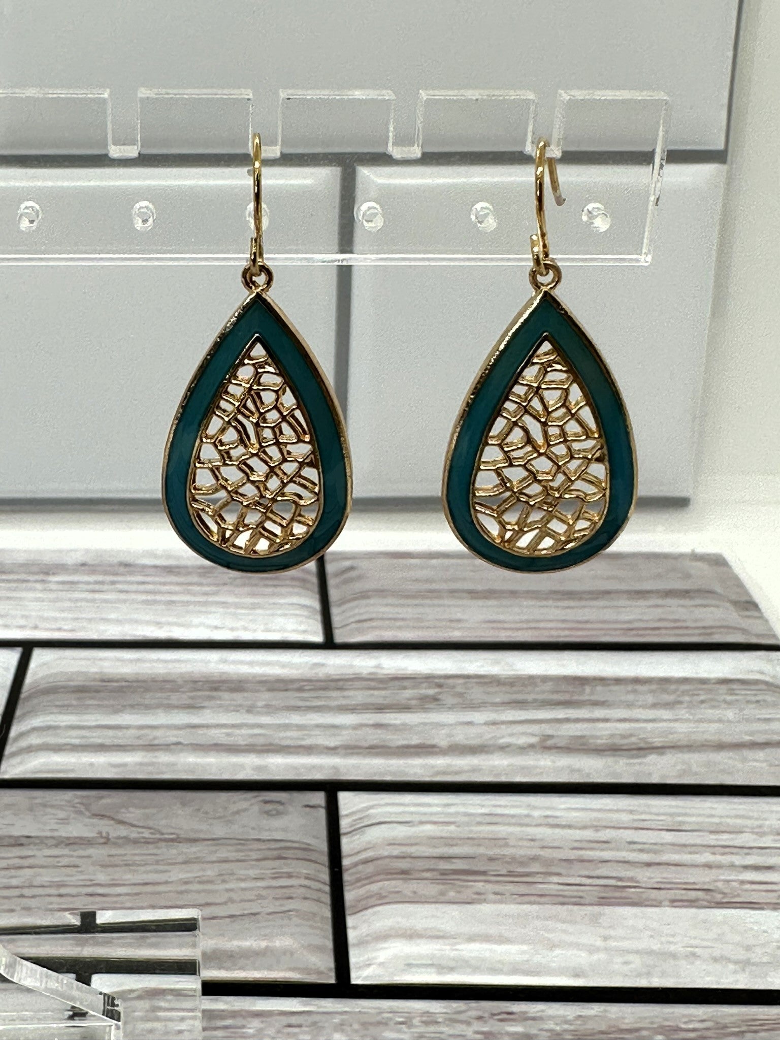 These stunning Teal & Gold Teardrop Earrings are the perfect accessory to add a touch of elegance to any outfit. The combination of the rich teal color and the shimmering gold accents make these earrings a standout piece.
