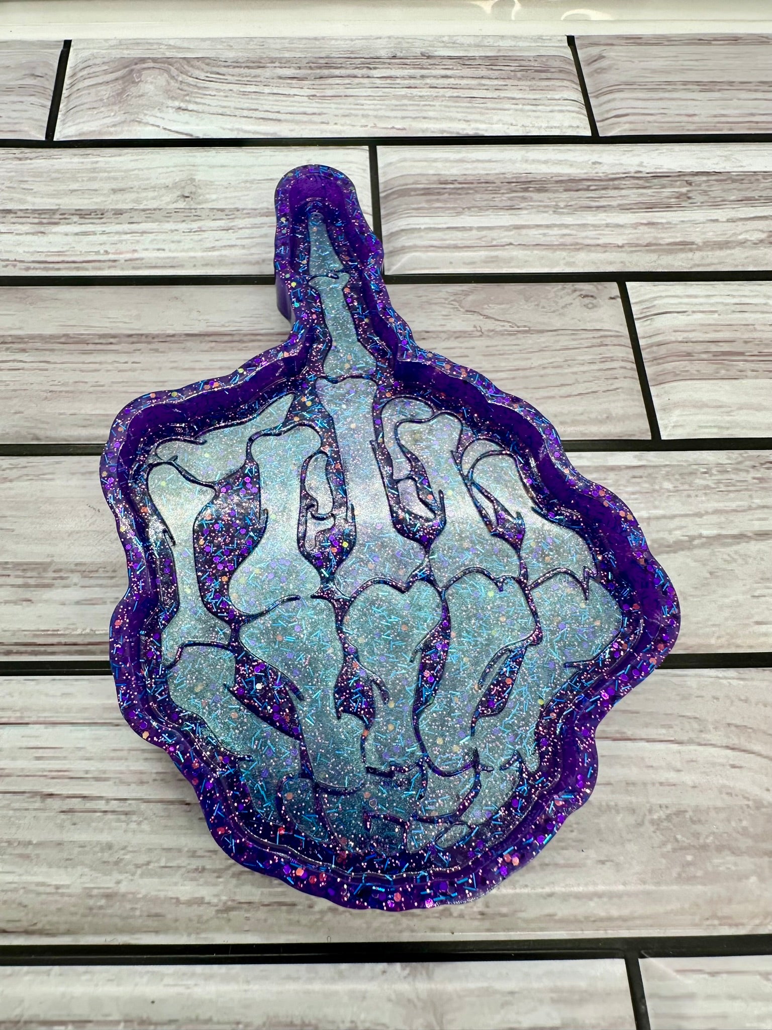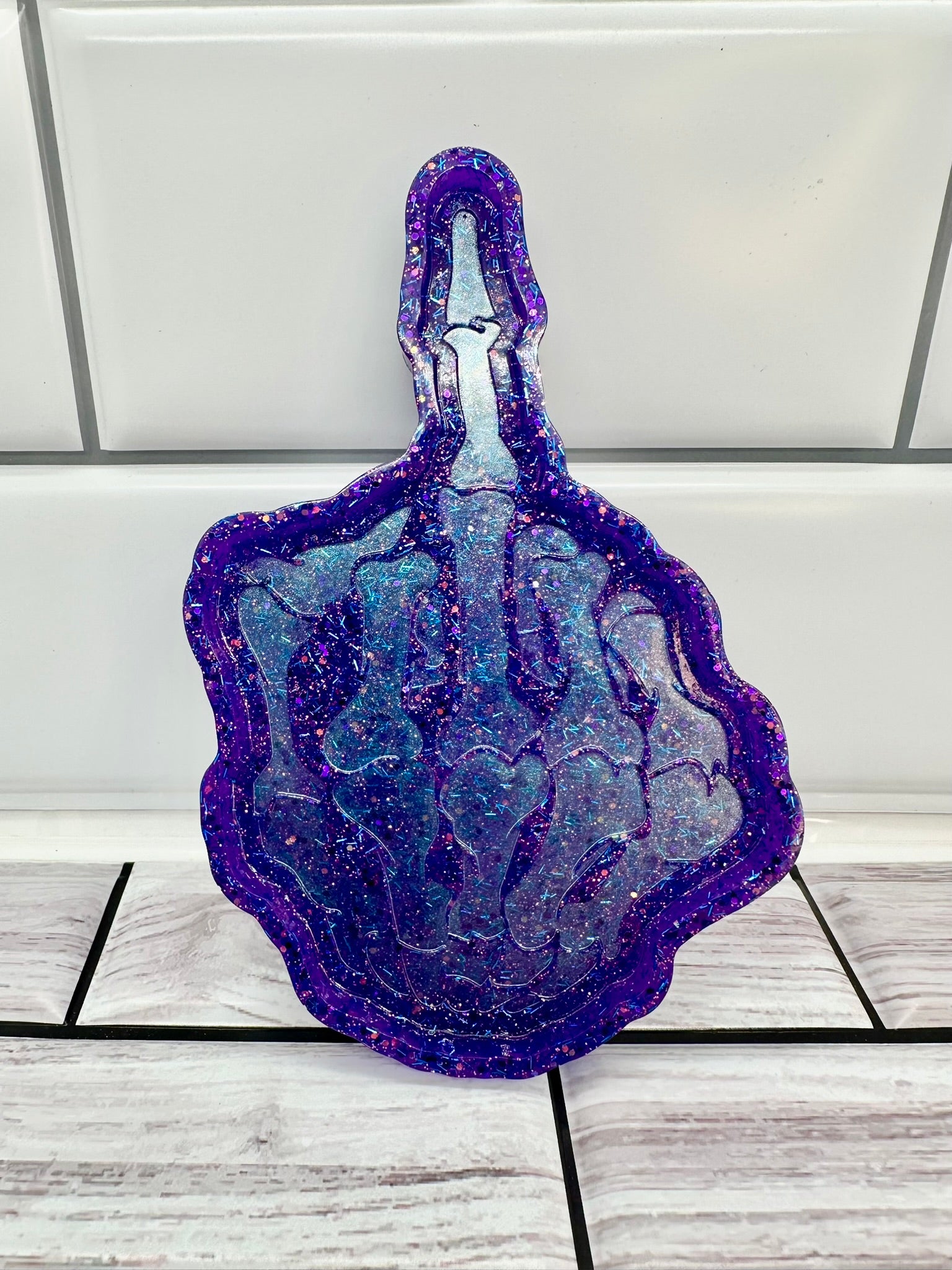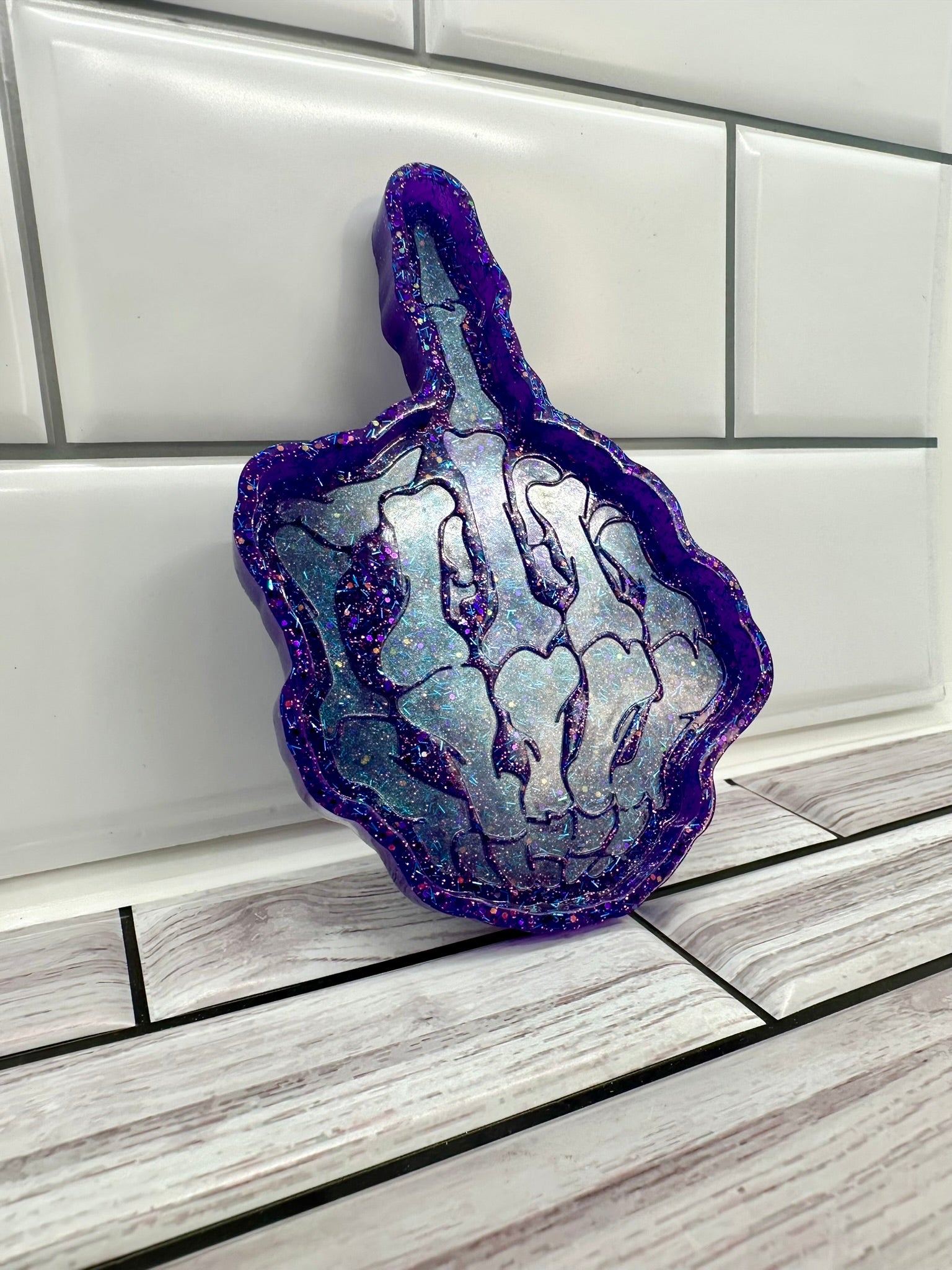 This unique and edgy trinket dish is a bold statement piece for any home. Crafted from resin, it features a skeleton hand with the middle finger extended, a playful yet rebellious gesture. The dish is a shimmering masterpiece of color and texture. The border is a deep, translucent purple, filled with sparkling glitter that catches the light beautifully. The skeletal hand itself is a stunning mix of iridescent blue, teal, and silver, also embedded with glitter, creating a mesmerizing, holographic effect. Perfect for holding keys, jewelry, or other small items, this dish adds a touch of macabre chic to your decor.