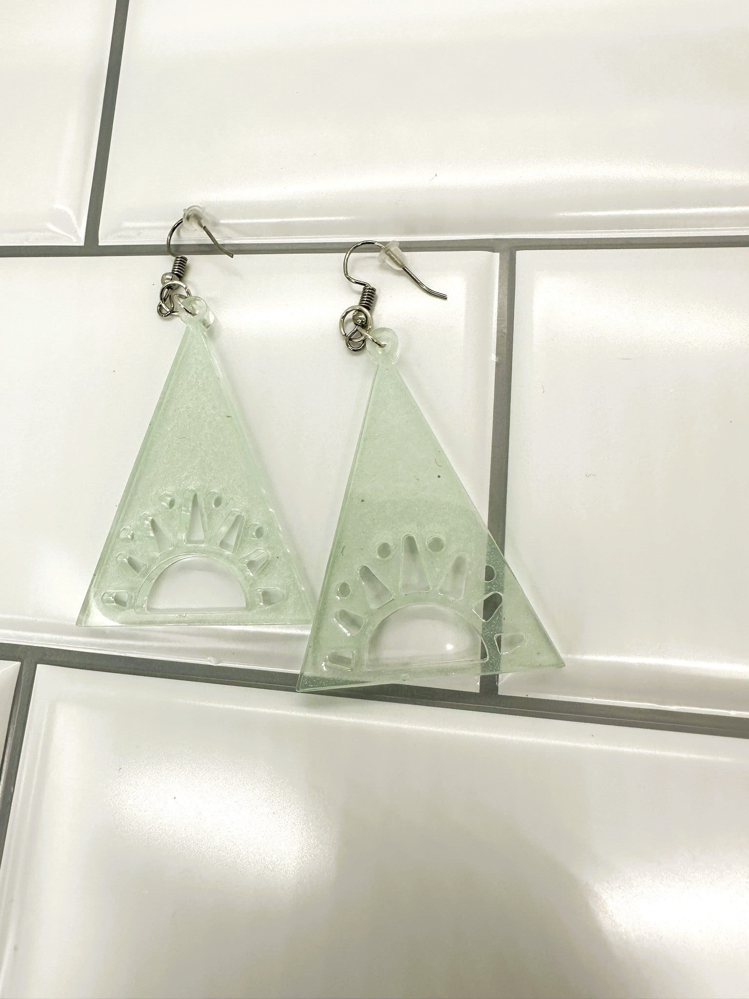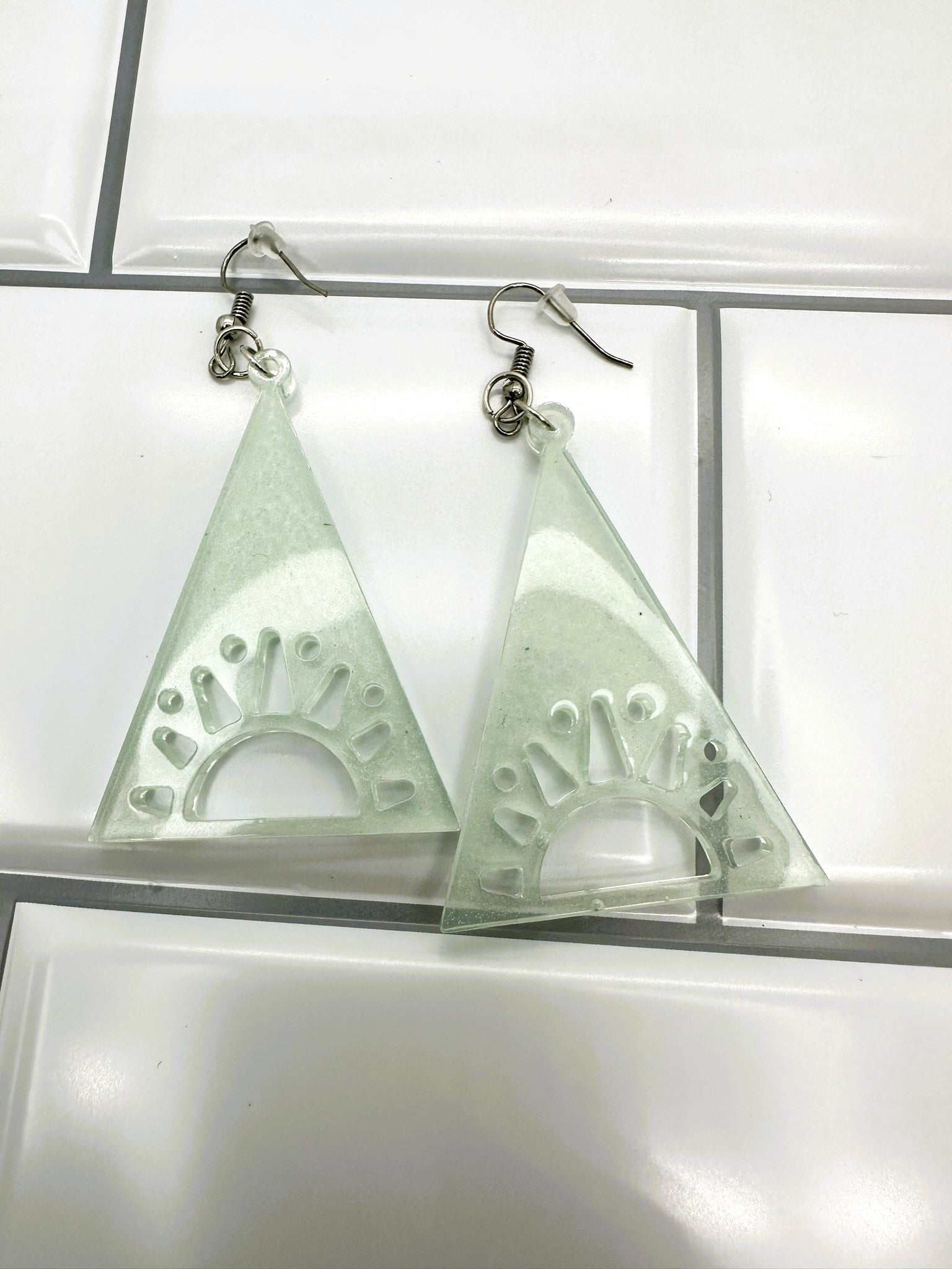 Introducing our stunning Triangle Sun Transparent Sea Foam Earrings! These exquisite earrings feature a pair of vibrant green triangle shapes that will add a touch of elegance to any outfit. Made with high-quality materials, these earrings are not only stylish but also durable. Whether you're heading to a special occasion or simply want to elevate your everyday look, these earrings are the perfect accessory to make a statement. Don't miss out on these unique and eye-catching earrings that are sure to turn heads wherever you go!