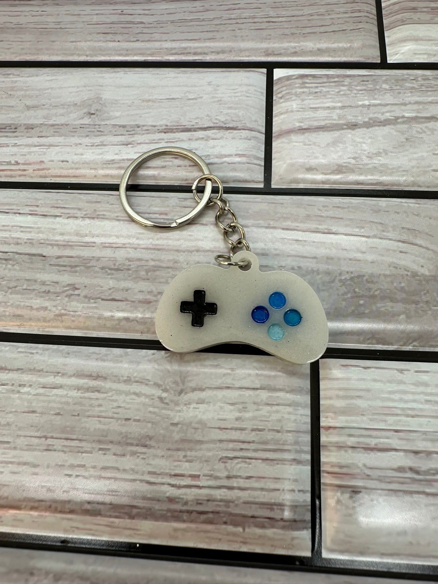 - White and blue game controller design: Show off your love for gaming with this stylish keychain.