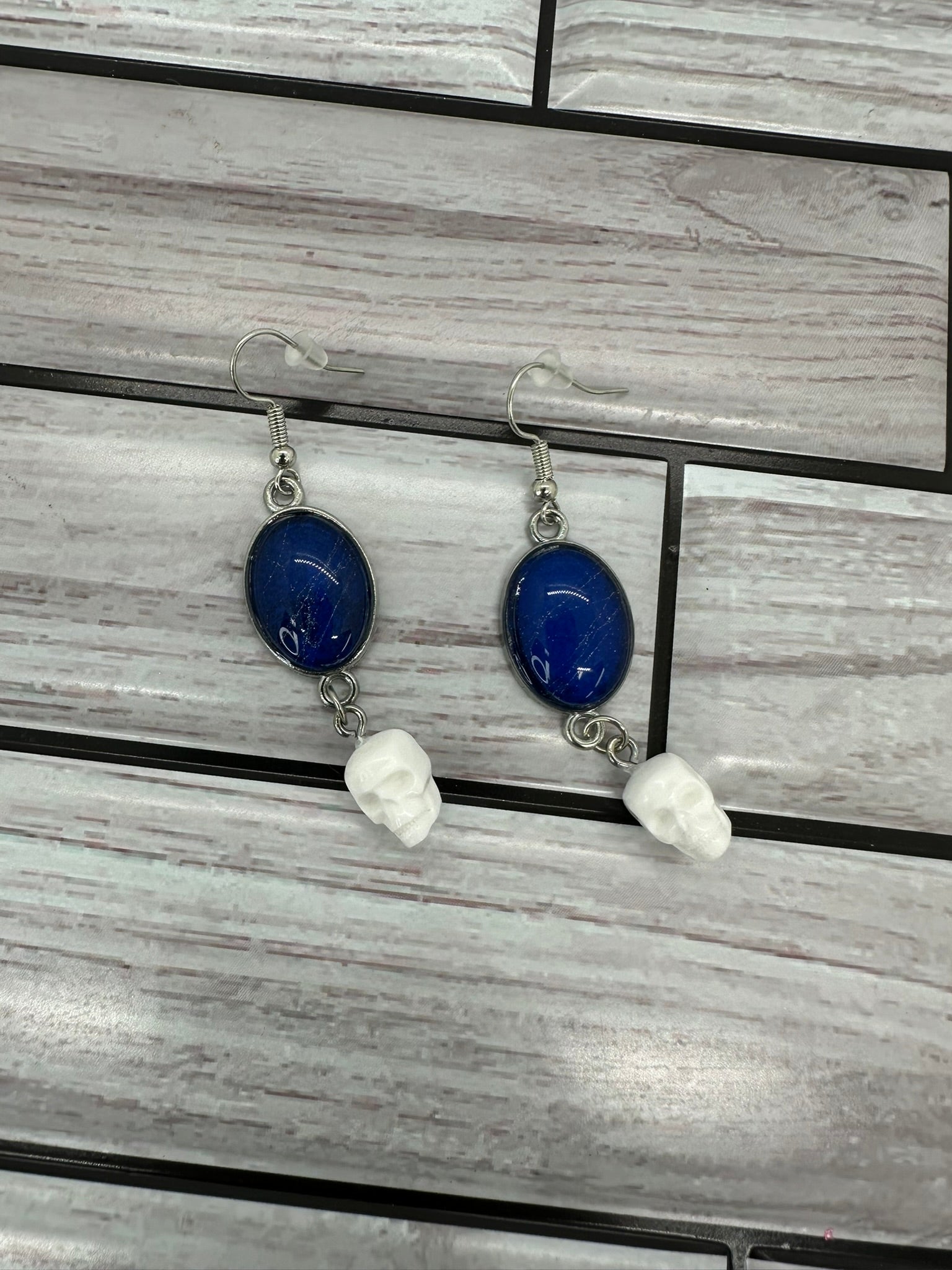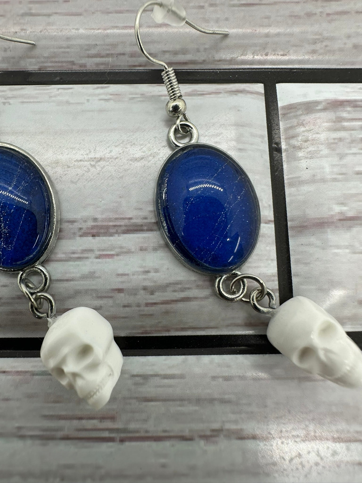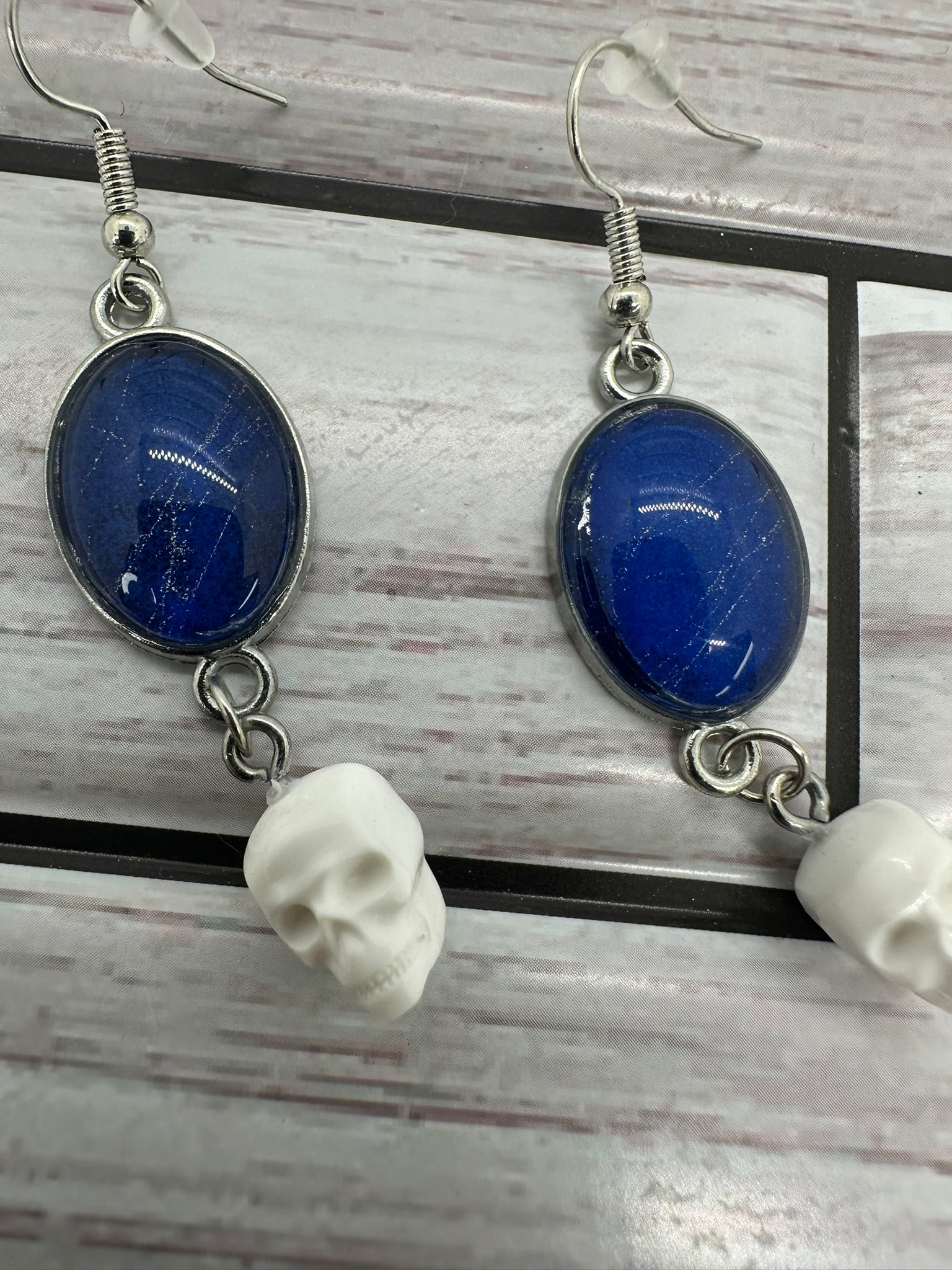 Web of Intrigue: These unique earrings are sure to turn heads. Each pair features a round, blue resin cabochon with a real spider web encased within. A silver-toned chain dangles from the cabochon, ending in a small, white skull charm. The earrings are lightweight and comfortable to wear, making them perfect for any occasion.