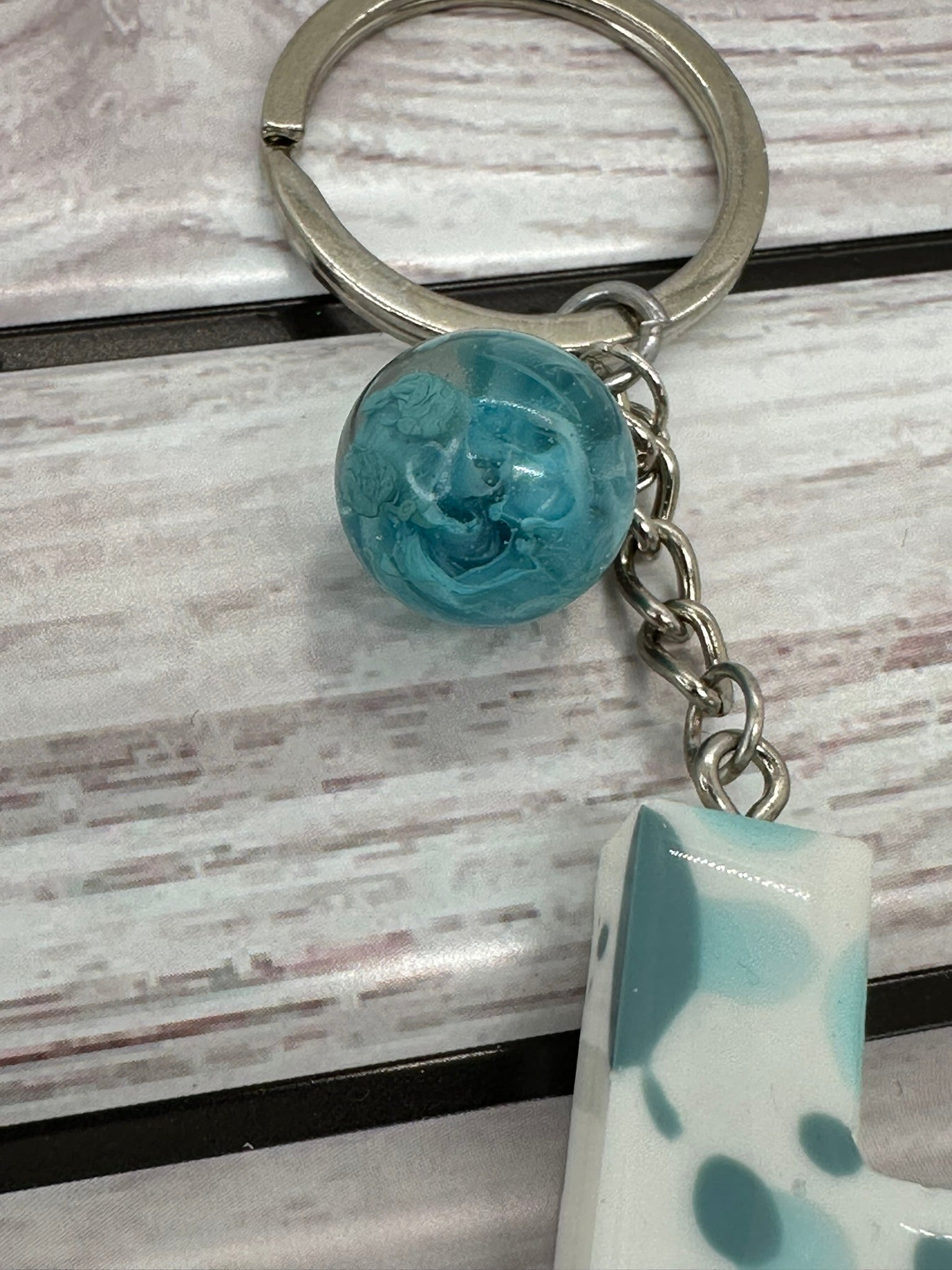 This charming keychain is a perfect blend of style and functionality. The keychain features a large letter H pendant, crafted from high-quality resin and adorned with a swirling pattern of turquoise and white. The pendant is paired with a small turquoise bead charm, adding a touch of whimsy and color. The keychain is finished with a sturdy silver-toned metal ring and chain, ensuring durability and long-lasting use.