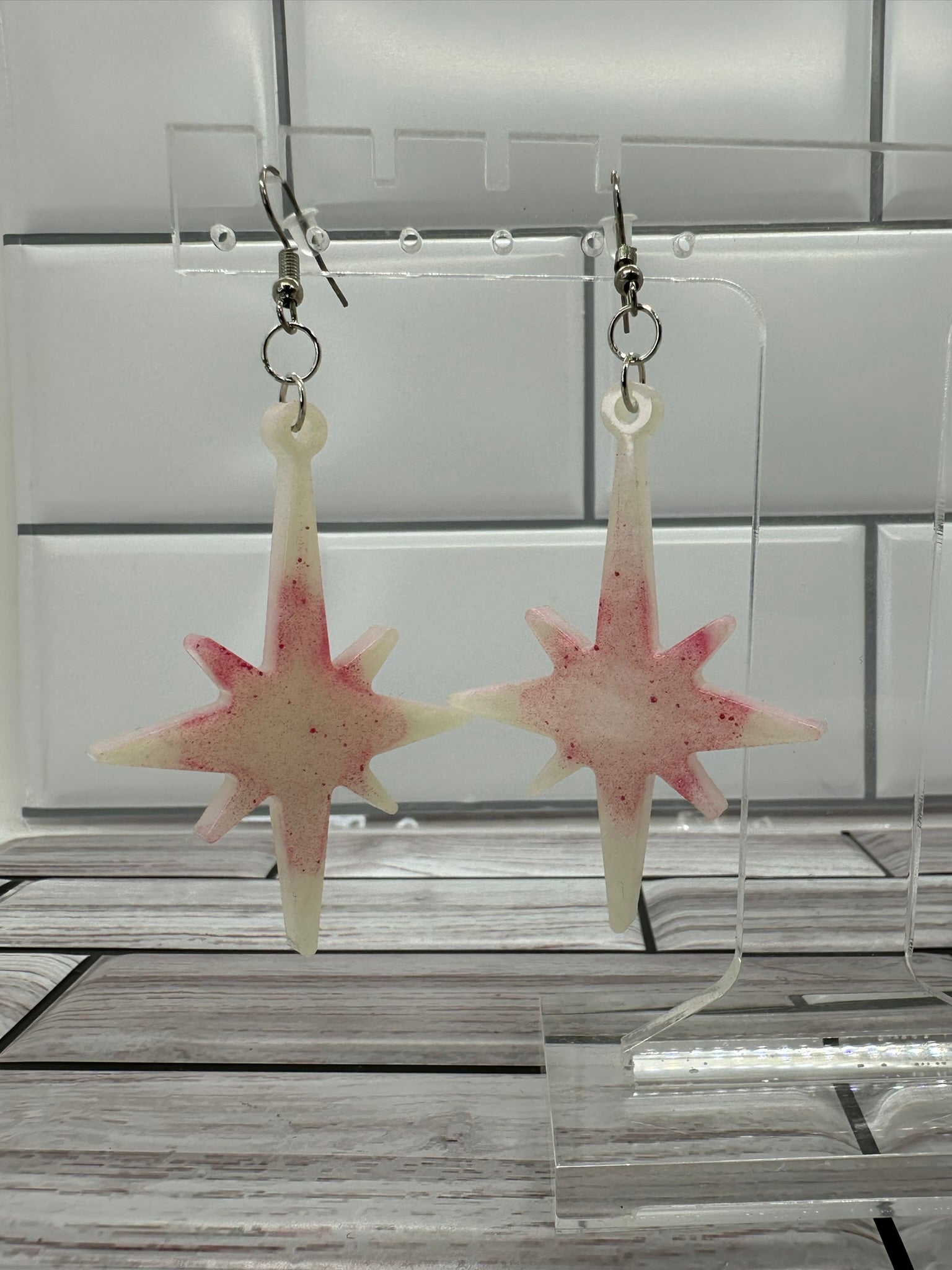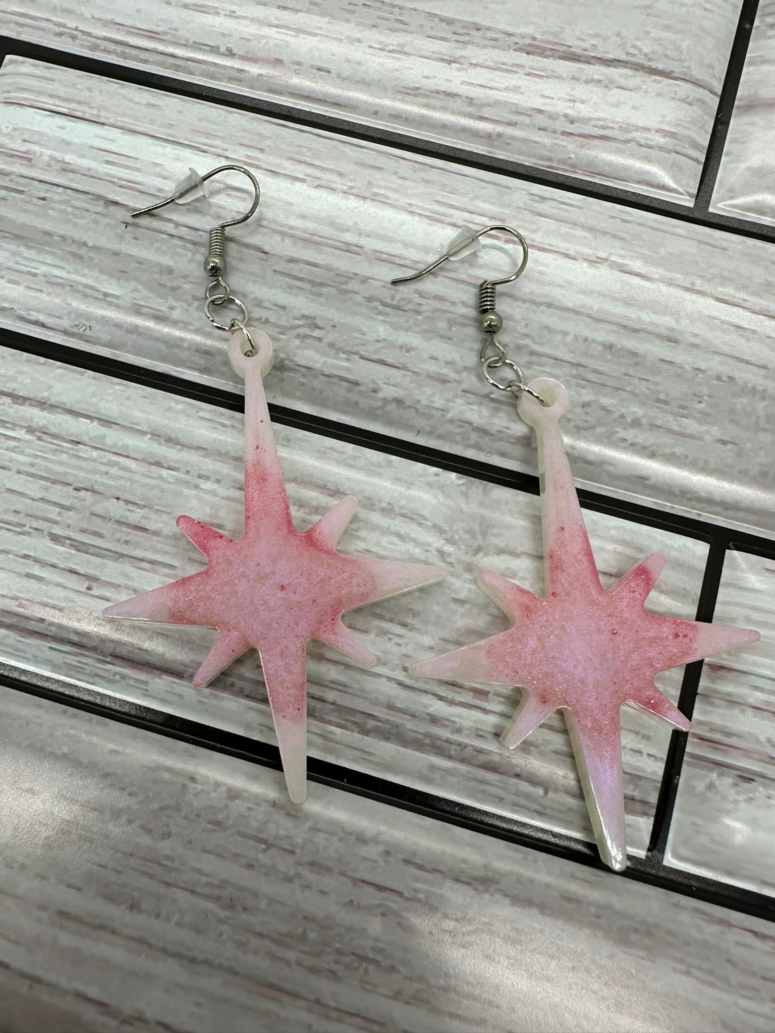 These White and Pink Shimmer Star Burst Earrings are a stunning addition to any jewelry collection. Perfect for adding a touch of sparkle to any outfit, these earrings are sure to make a statement wherever you go.